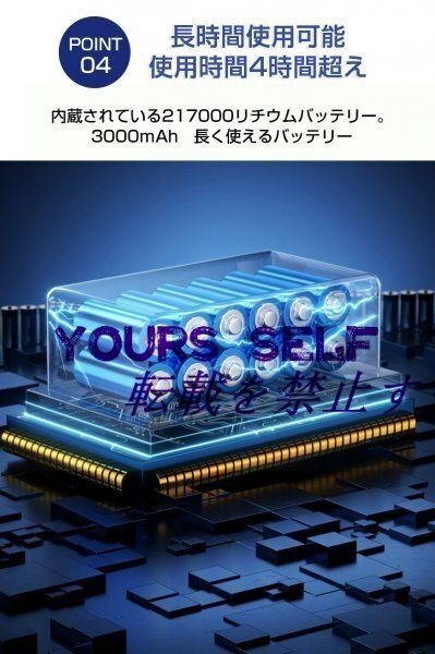 ・超長のバッテリー持続時間、1つのモードで最大4時間使用可能、電池容量は3,000mAhの大容量。充電はUSB Type-C。
