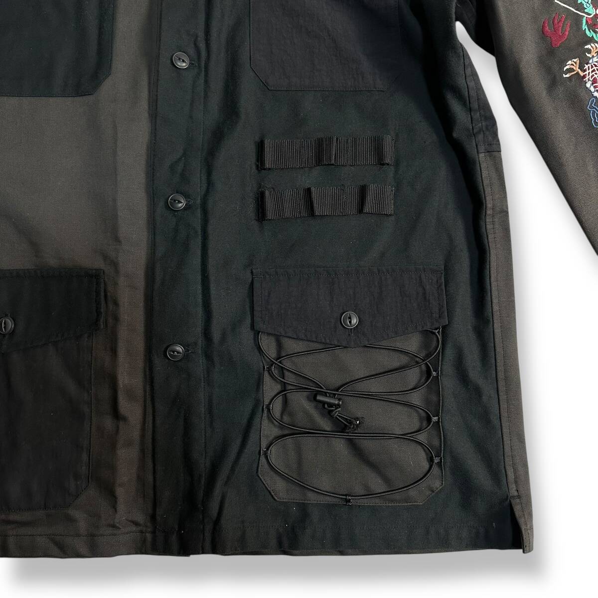 両袖には手書きの龍を刺繍し、左身頃には簡易的なモールシステムを採用左裾ポケットにはバンジーコードを配備し簡易的な収納機能(マスク等)になっております