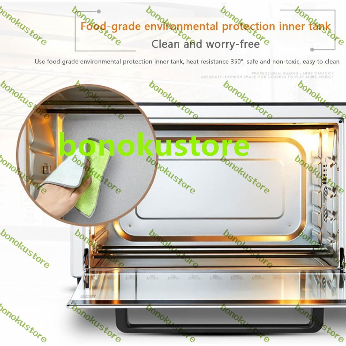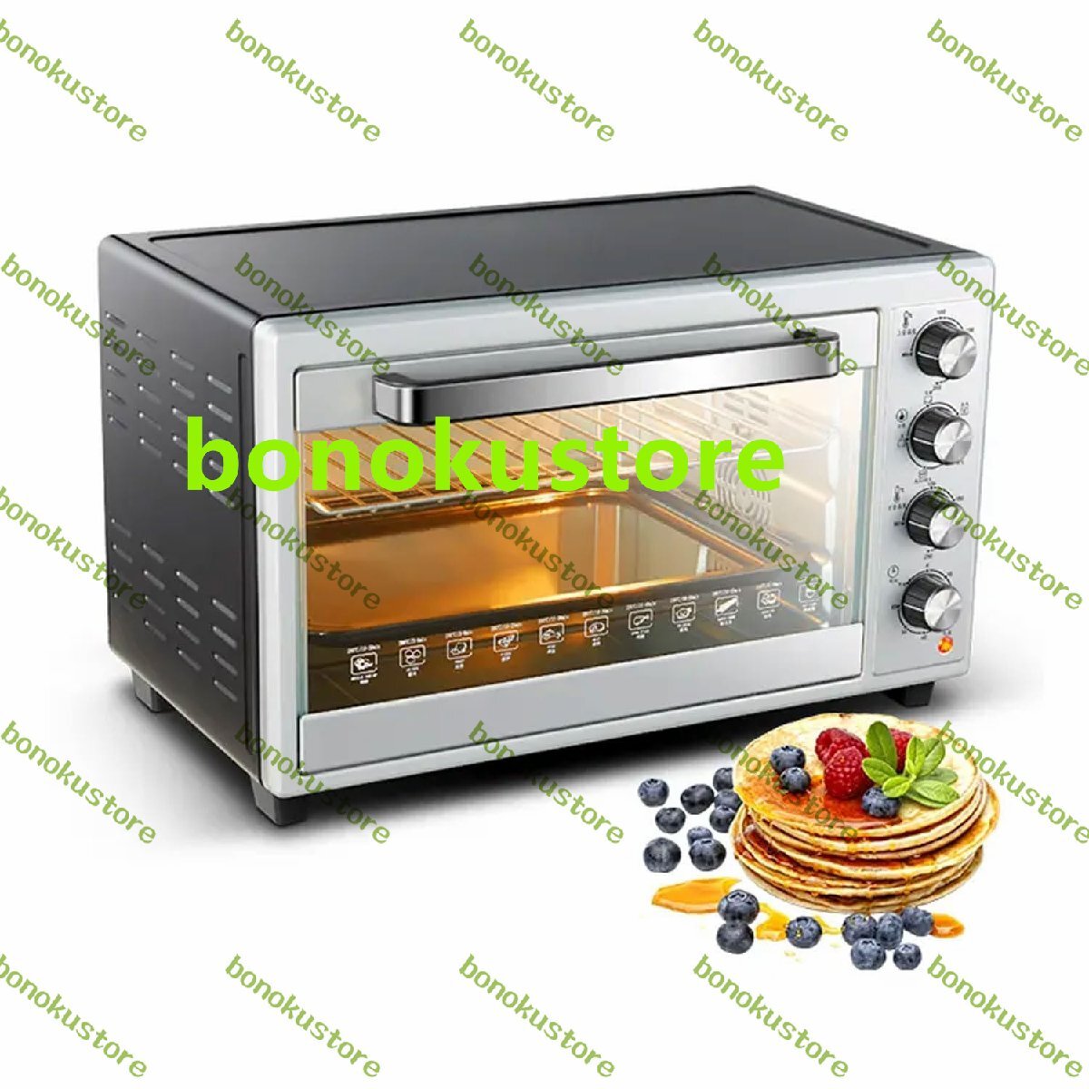 デスクトップ60L商業ピザオーブン、1800W電気ステンレス鋼ベーキングオーブン、360°回転グリルフォーク付き、高温耐性照明付き、ステーキ、七面鳥、ローストダック、パン用