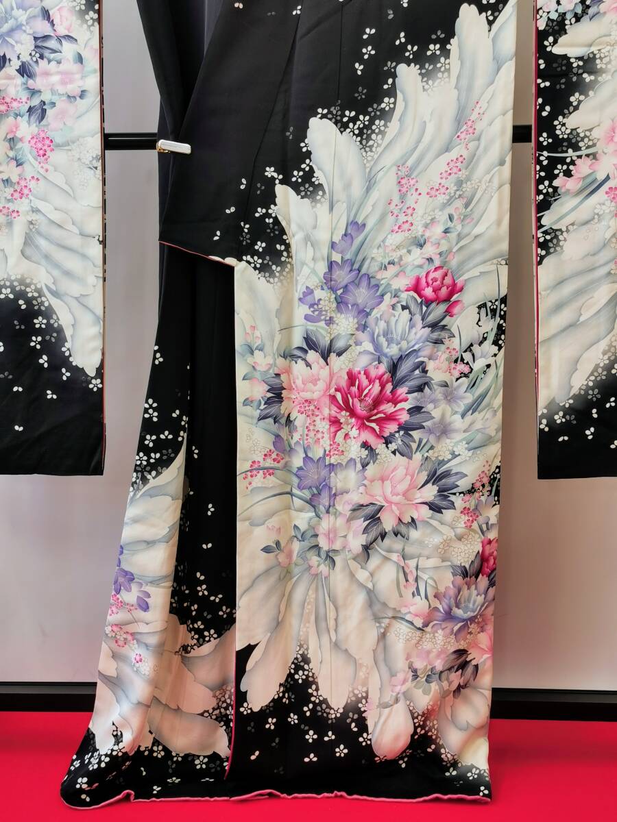 シックで人気の黒系振袖に、白を基調とした大きな洋花の中に、