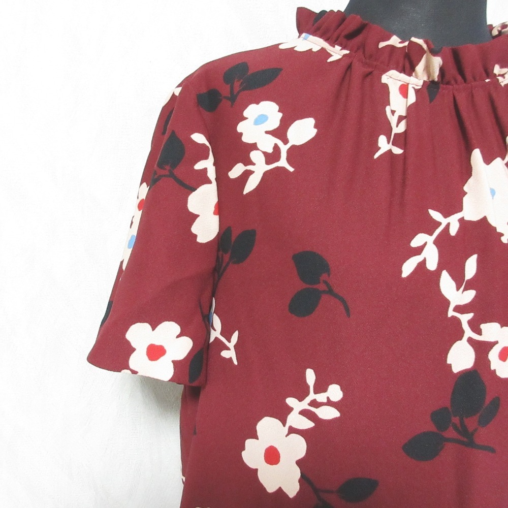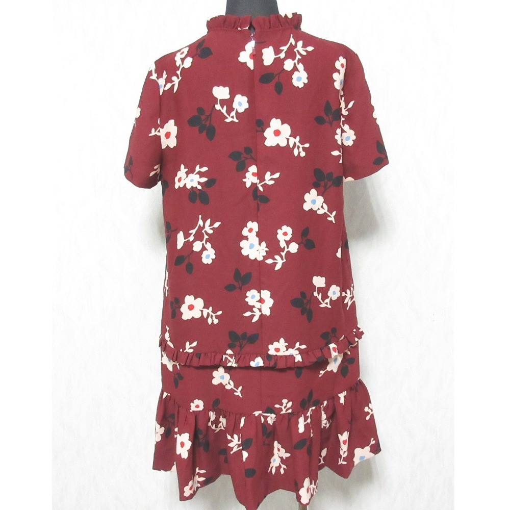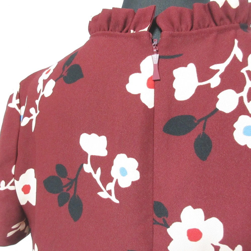 商品名:美品 kate spade new york ケイトスペード フラワープリント 半袖 フリルカラー ひざ丈 フレアヘム ワンピース ドレス S ダークレッド