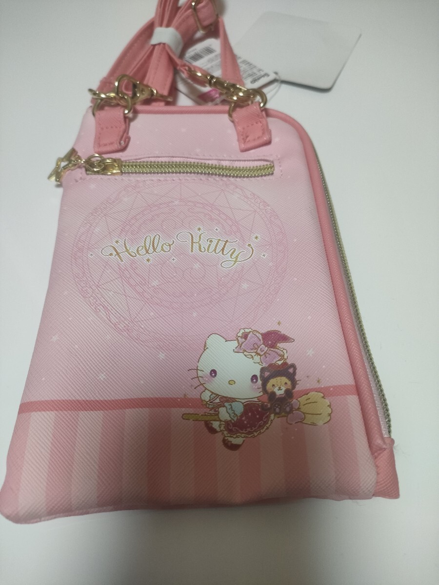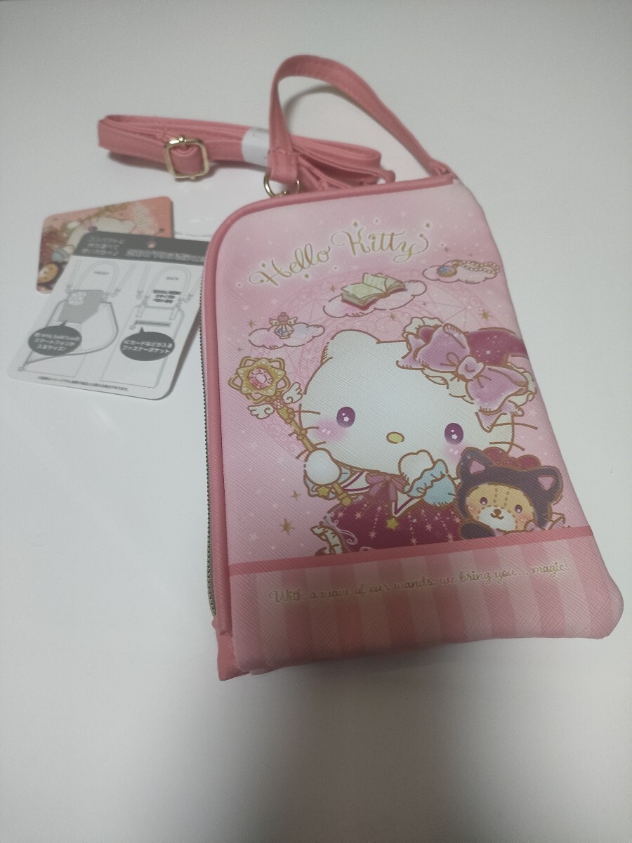 100% ハローキティの2WAYマルチポシェット まじかる です。 ベルトは2サイズ付き♪ ファスナーが大きく開いて使いやすい♪
