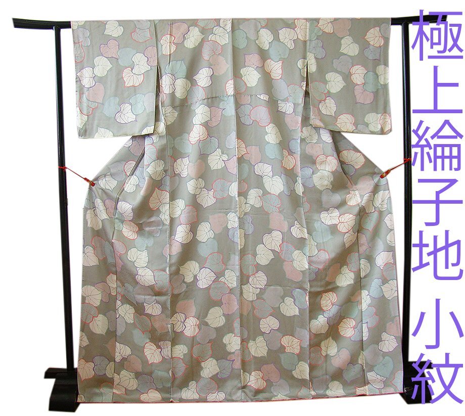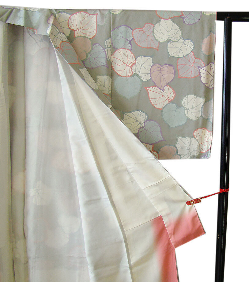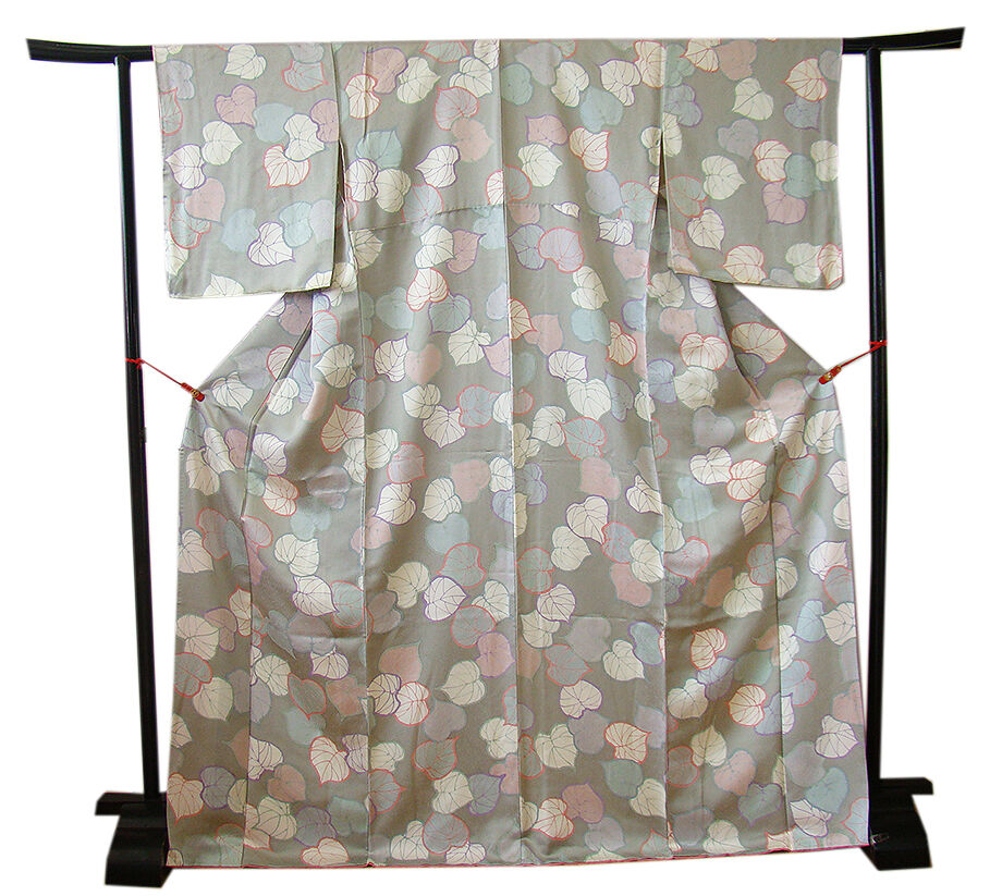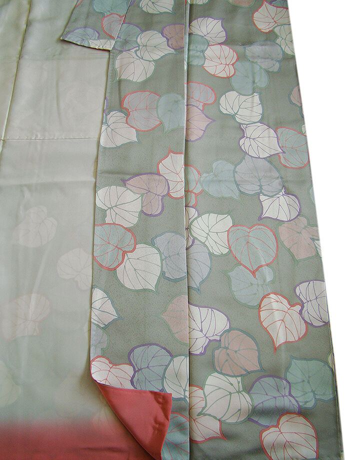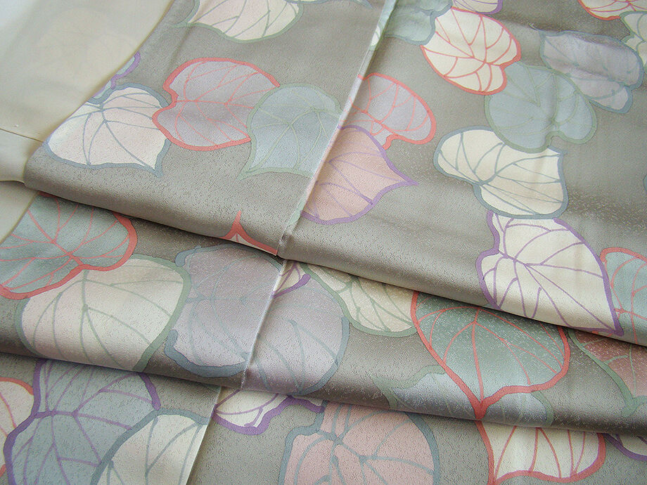 商品説明 | こちらのお品は「袷」でございますので、10月~5月までお召頂ければと思います。 大変しなやかで柔らかな手触りの着心地良い滑らかな極上綸子地の生地、 薄鈍色地に木の葉柄の染柄、 八掛は桃色(正絹)、幅広い年代の方にお召頂けます。 |