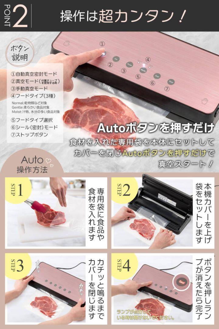 その他手動真空、密閉(シール)のみ、付属のチューブを使用した真空モード(※真空専用チューブに対応している容器やボトル・瓶のストッパーを使用してください)が搭載されています。