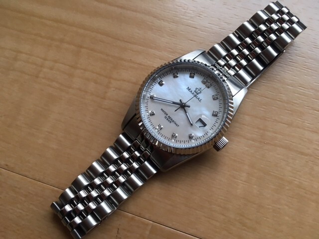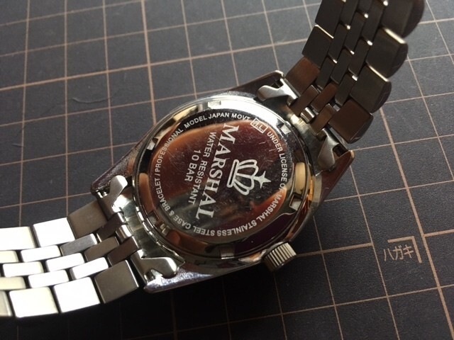 良品 良デザイン レア MARSHAL マーシャル デイト シェル文字盤 石付インデ ギザベゼル 純正ブレス クオーツ メンズ 腕時計
