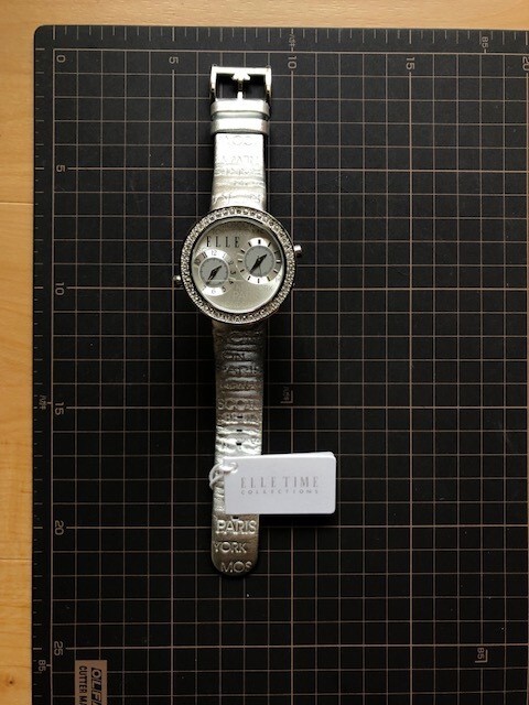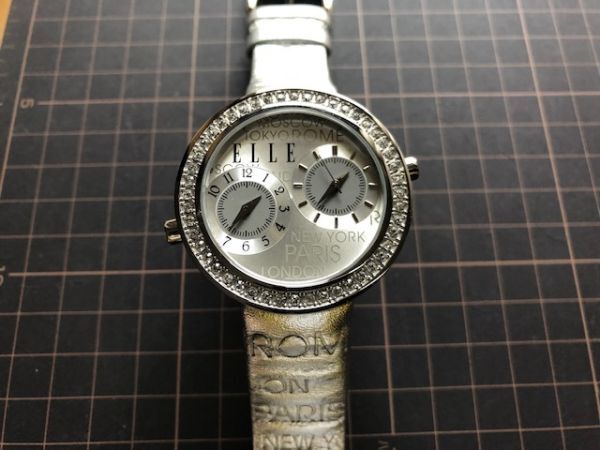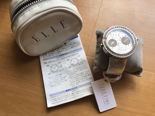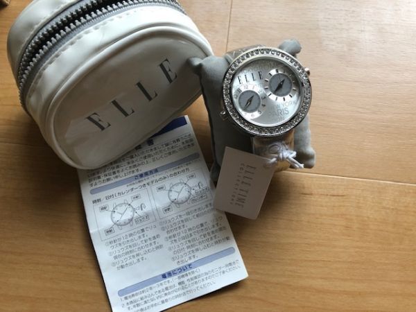 新品同様 ケース有 レア ELLE エル TIME デュアルタイム ストーンベゼル EL20038S20N ロゴ入純正革ベルト クオーツ レディース腕時計