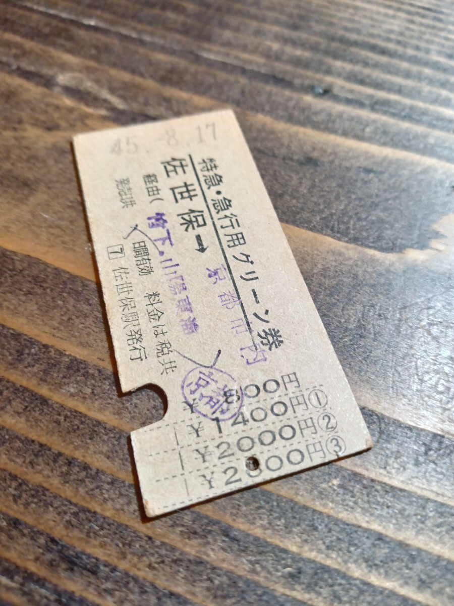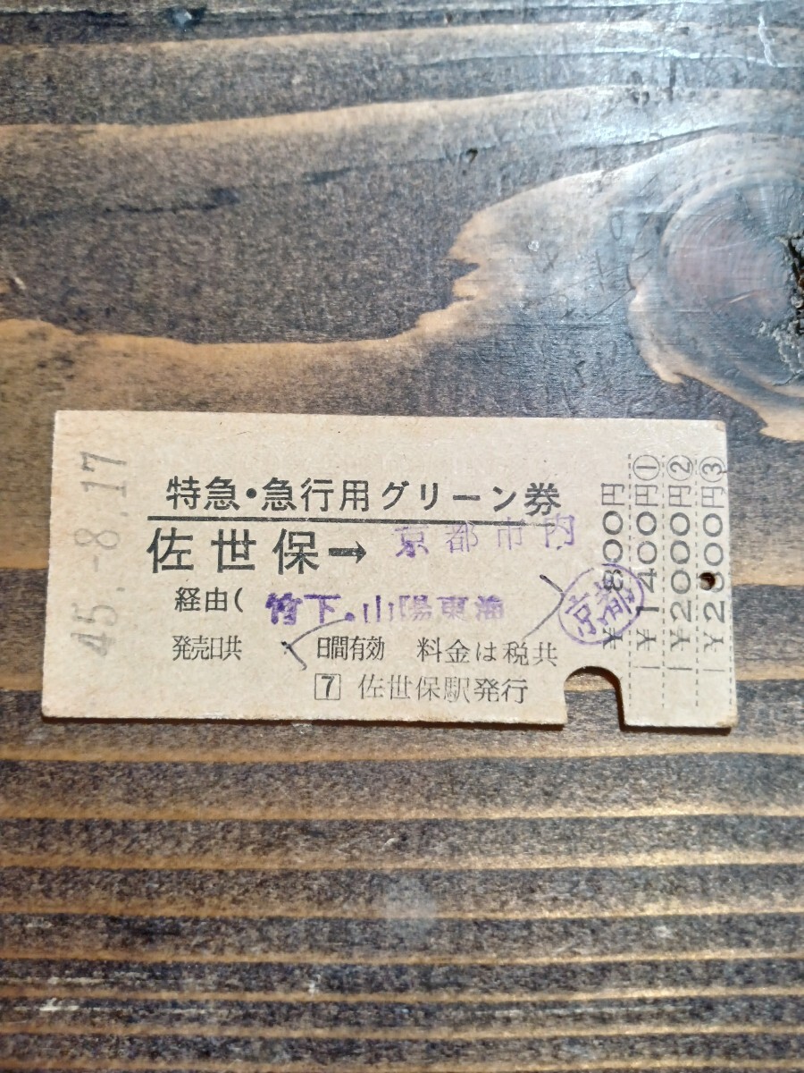 国鉄 硬券 準D型硬券 特急 急行用 グリーン券 佐世保→京都市内 竹下 山陽 東海経由 S45.8.17 佐世保駅発行(鉄道コレクション 鉄道資料)