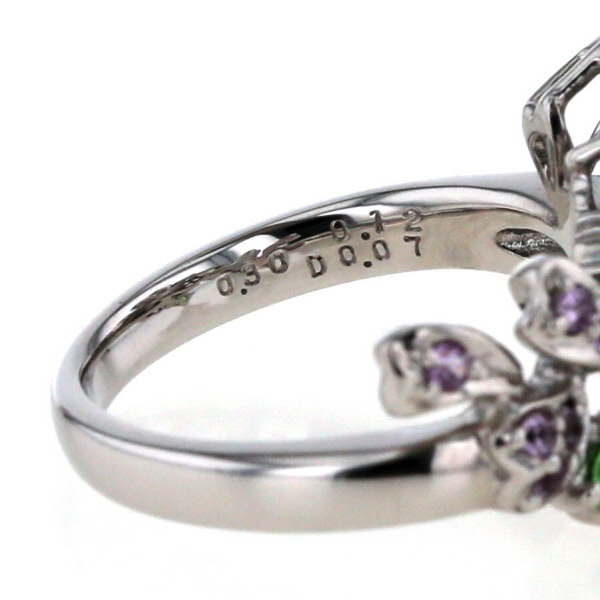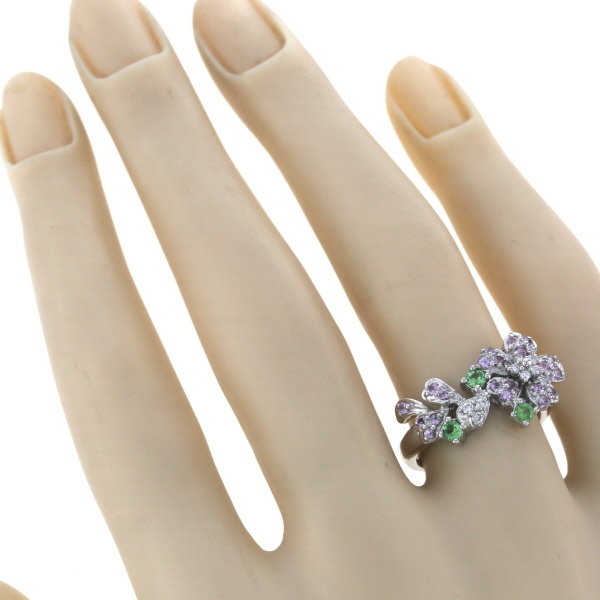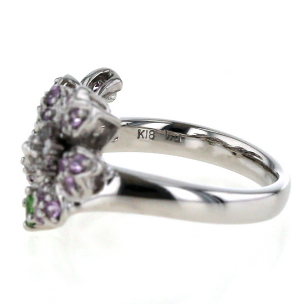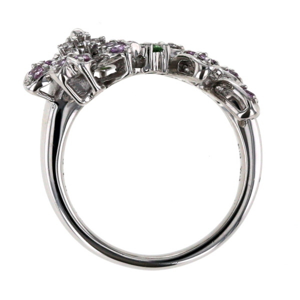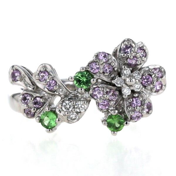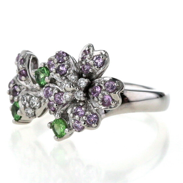| 商品紹介 | ホワイトゴールドをベースに、ダイヤモンド,ピンクサファイア、ツァボライトをあしらったフラワーデザインのリングです。 存在感があり豪華なデザインです。 |