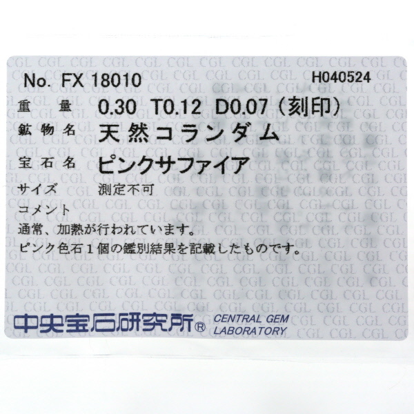 | 石目 | ダイヤモンド 0.07ct ピンクサファイア 0.30ct ツァボライト 0.12ct |