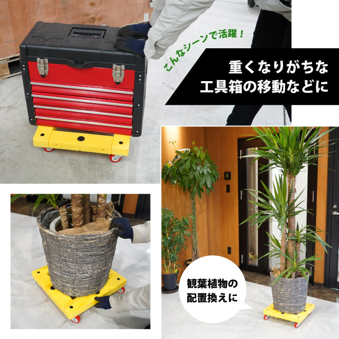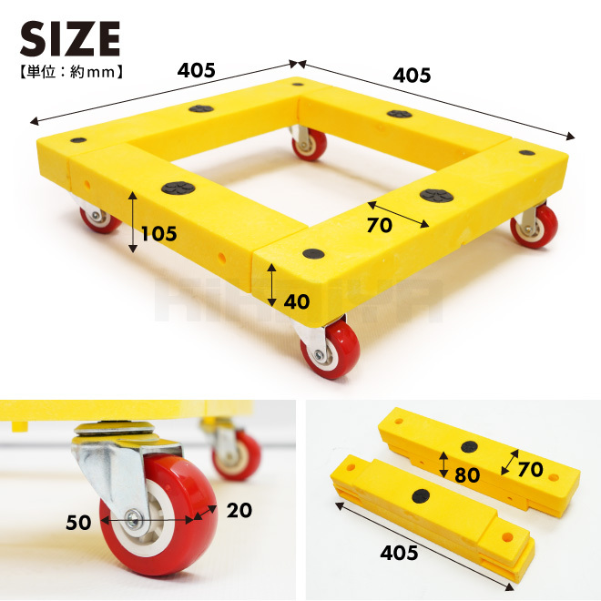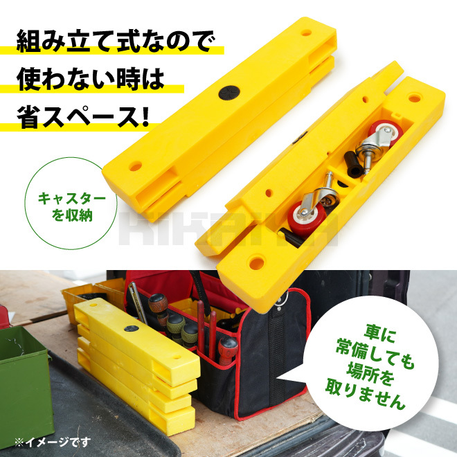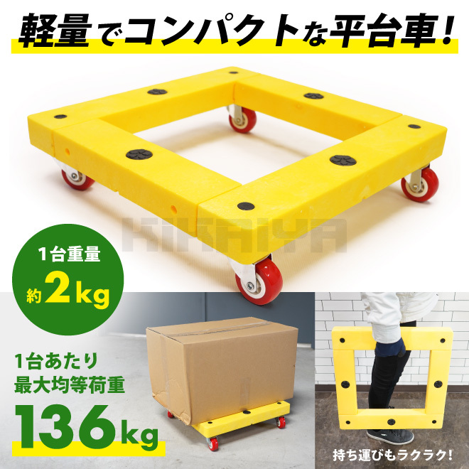 ●軽量でパワフル!コンパクトになる平台車の2台セットです ●1台約2kgと軽量なので手軽に使用でき、持ち運びにも便利です ●組み立て式なので、使わない時はコンパクトに収納しておくことができます ●車に常備しても場所をとらず、キャンプや買い物にも役立ちます ●全キャスターが360度自在に回転するので、どの方向でも自由に動かせます ●ポリウレタンキャスターは摩耗しにくく、ベアリング入りなので動きもスムーズです ●台車の上部に滑り止めがついています ●プラスチック製で軽く、水や錆に強いです ●台の横にφ10mmの穴が開いており、紐などを通して引くことも可能です ●ちょっとした重い荷物の運搬など、日々の負担を簡単にする商品です ★2台セットでお届けする商品となっております |