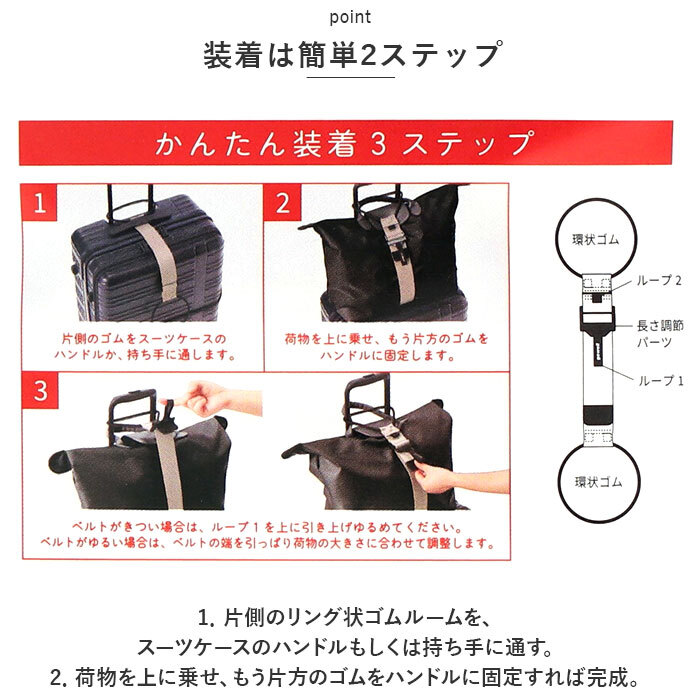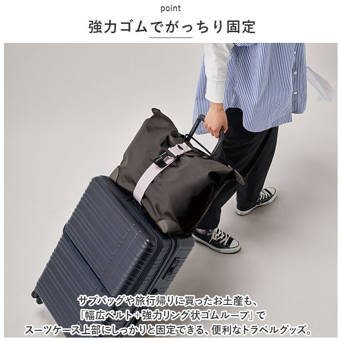 | 商品説明 | ・・旅行帰りに増えた荷物や、サブバッグをがっちりホールド!荷物をまとめて、移動がラクラク「gowell バッグとめるベルト3.0」が新登場。 ・【強力ゴムでがっちり固定】 ・サブバッグや旅行帰りに買ったお土産も、「幅広ベルト+強力リング状ゴムループ」でスーツケース上部にしっかりと固定できる、便利なトラベルグッズ。 ・【大きめ荷物も留められる!】 ・従来品の「バッグとめるベルト」よりもリング状ゴムループが長めに設計され、大きめの荷物にも対応。デザインもカラーもスタイリッシュにアップデート。 ・【装着は簡単2ステップ】 ・1.片側のリング状ゴムルームを、スーツケースのハンドルもしくは持ち手に通す。 ・2.荷物を上に乗せ、もう片方のゴムをハンドルに固定すれば完成。 ・【ベルト長さは片手でラクラク調節】 ・ベルトがきつい場合は、「gowell」のロゴがプリントされた黒いループを上に引き上げてベルトを緩め、ベルトが緩い場合には、レザー調カバーの付いたベルト端部分を軽く引っ張ることで荷物の大きさに合わせて調節が可能。 ・【アレンジ自在のループ付き】 ・・「gowell」のロゴがプリントされたループは、カラビナやお気に入りのチャームでアレンジすれば、自分の荷物の目印にできて便利! ・【ひったくり防止にも効果的】 ・荷物のスーツケースからの落下を防ぐことができ、ひったくり防止や紛失防止にも役立つ、旅行時の必須アイテム。 |