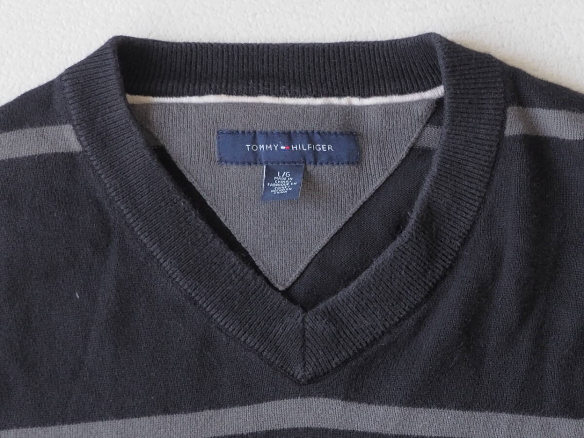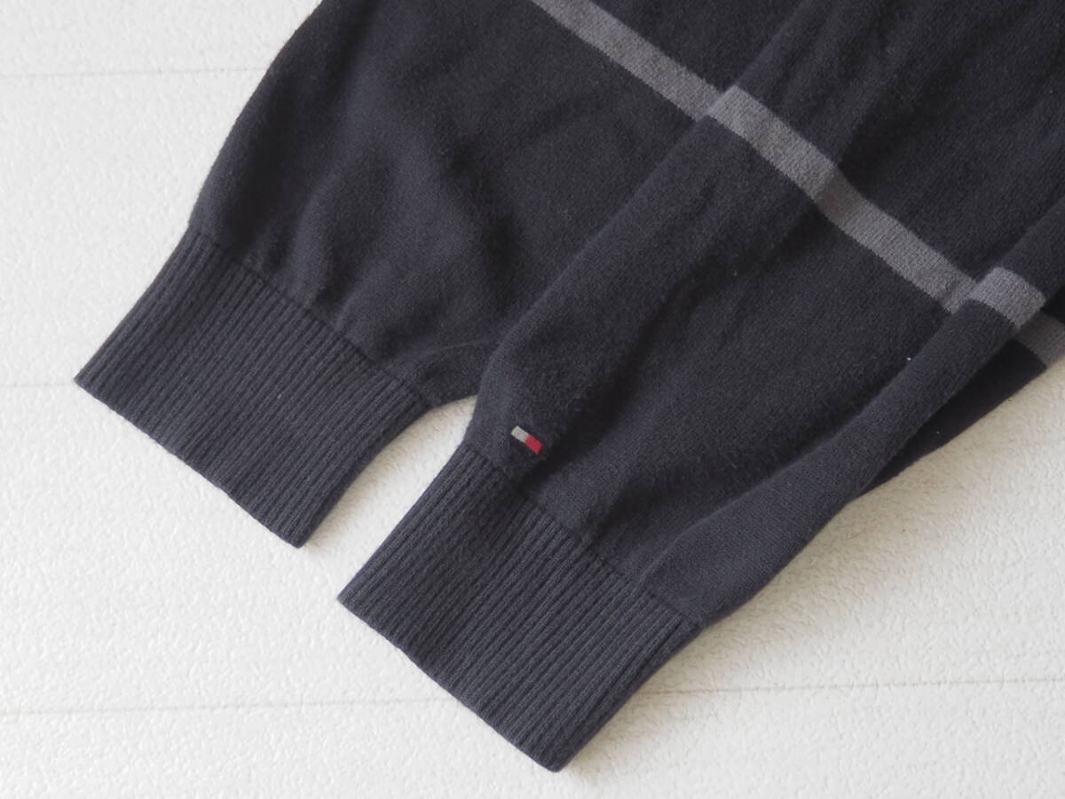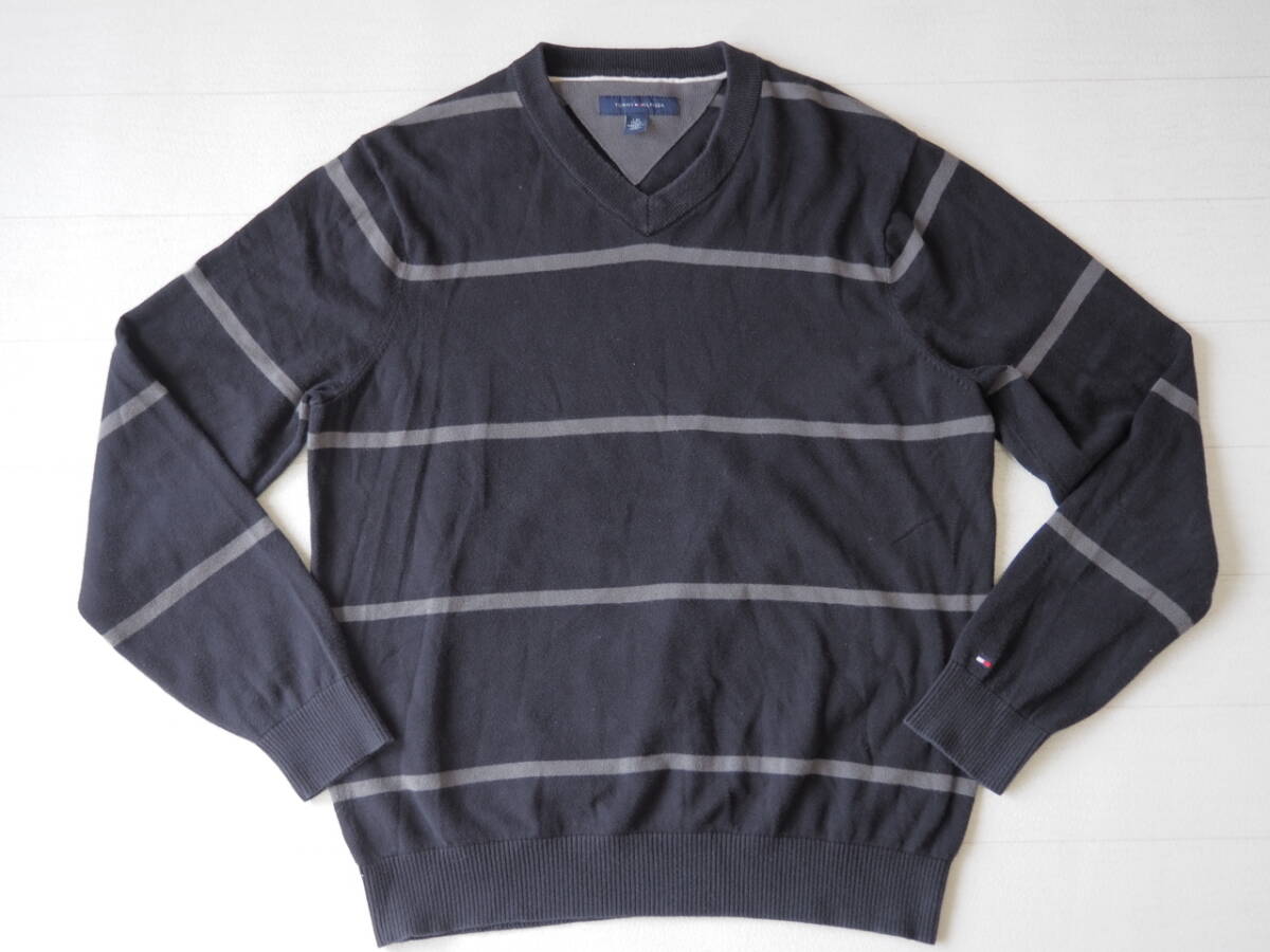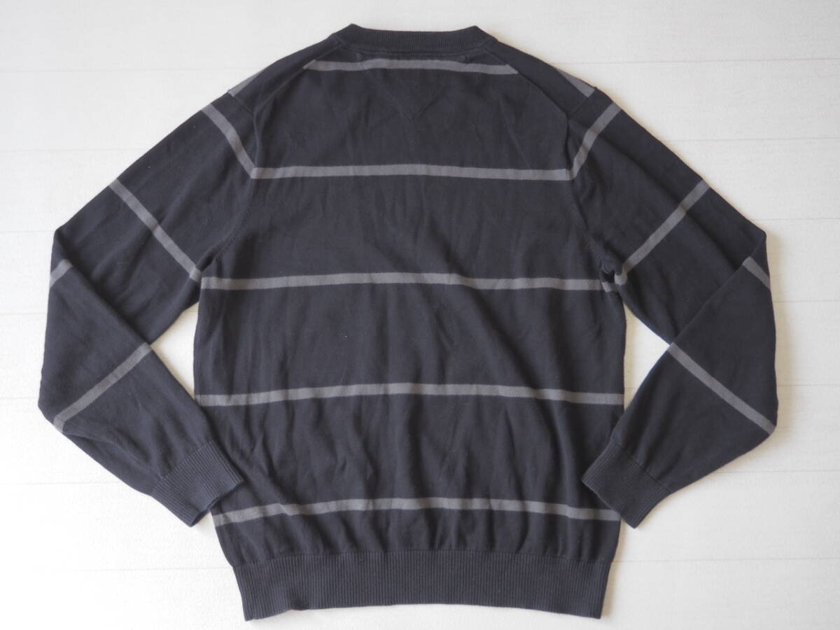 ☆送料無料☆ TOMMY HILFIGER トミーヒルフィガー USA直輸入 古着 Vネック ボーダー ロゴ ニット セーター メンズ L ブラック 中古 即決