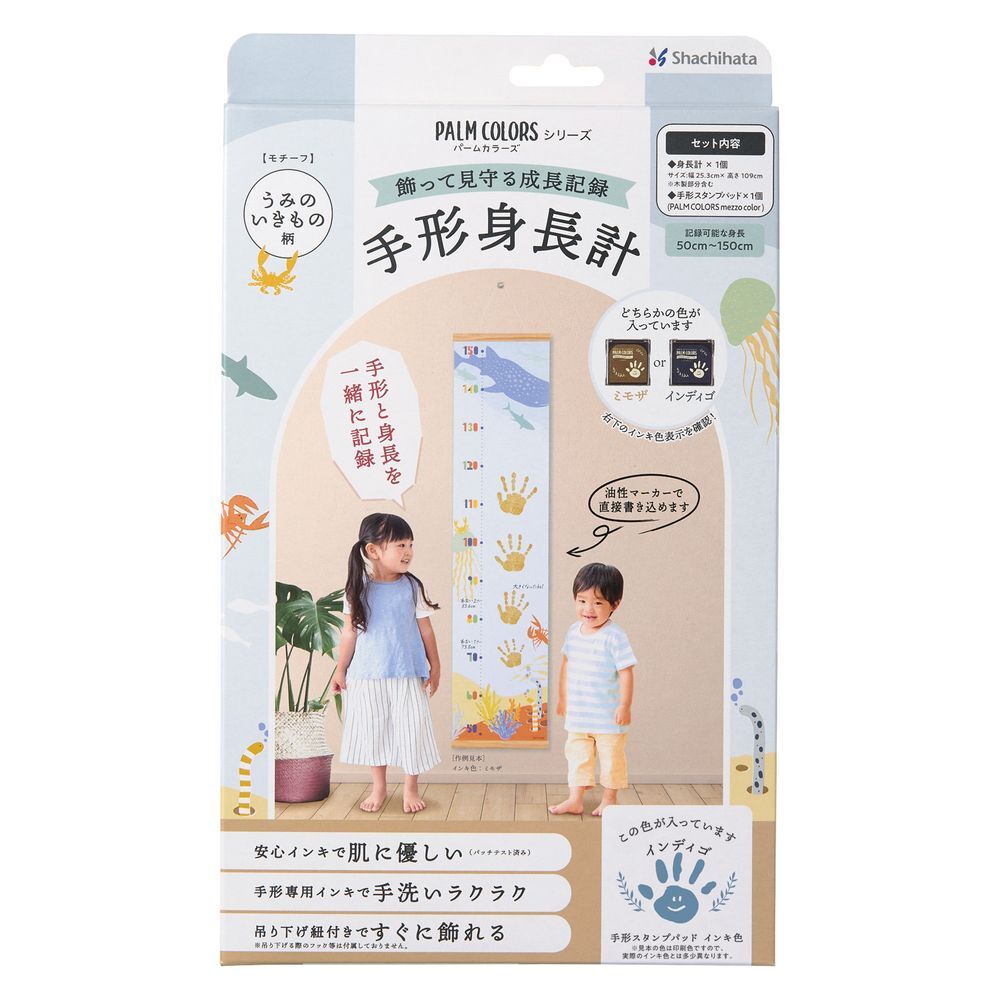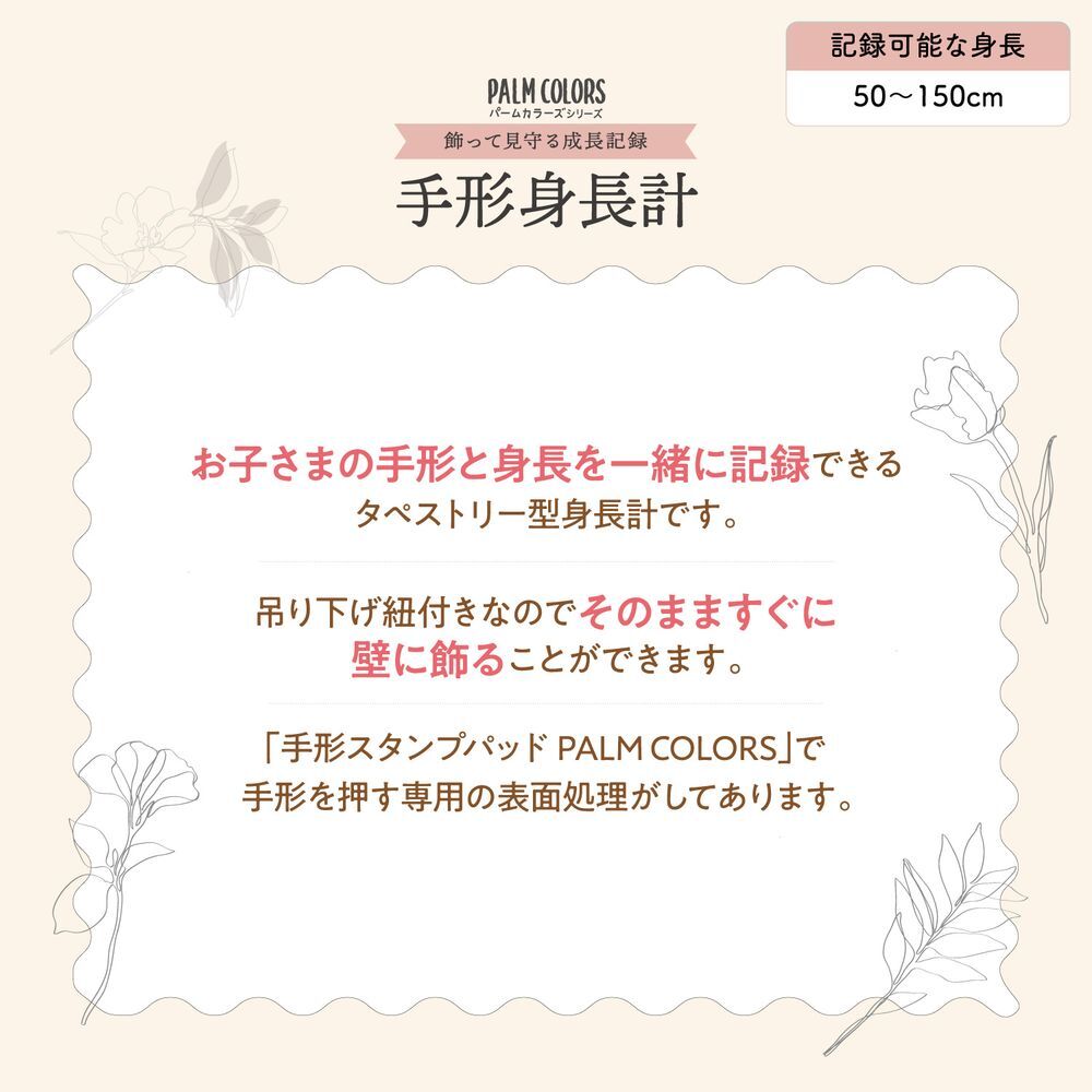 ○肌にやさしく簡単に洗い落とすことができるインキが特長の手形スタンプパッド「パームカラーズ メゾカラー」を使い、お子様の手形と身長を一緒に記録できるタペストリー型身長計です。