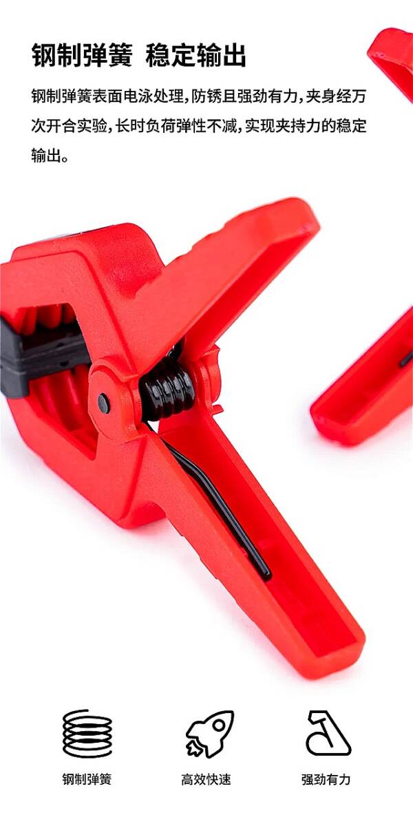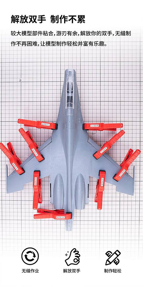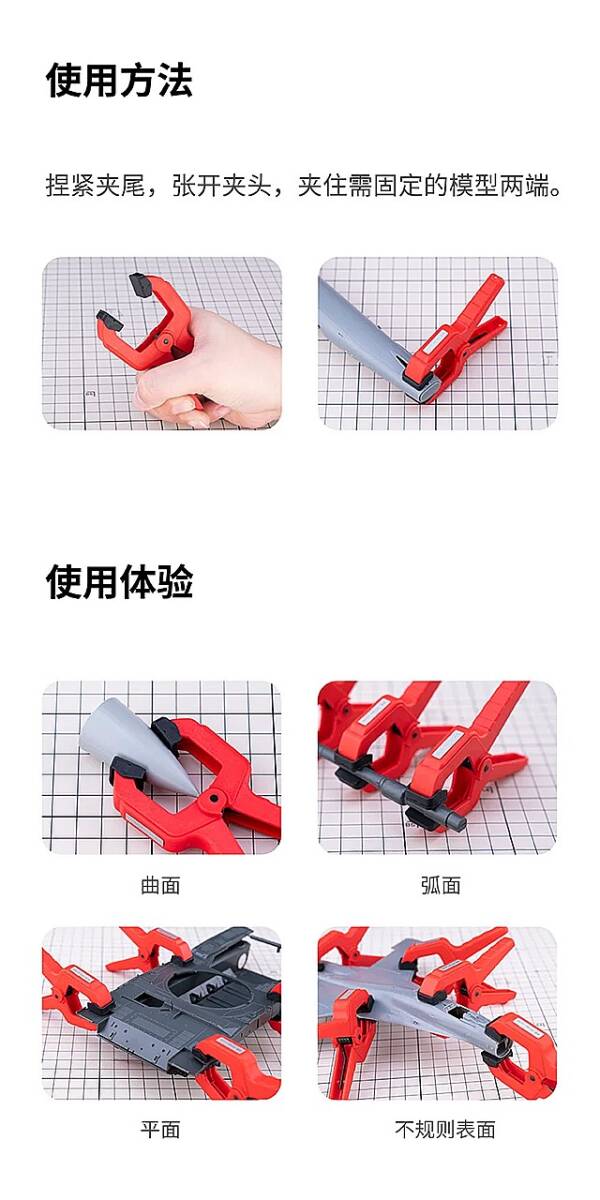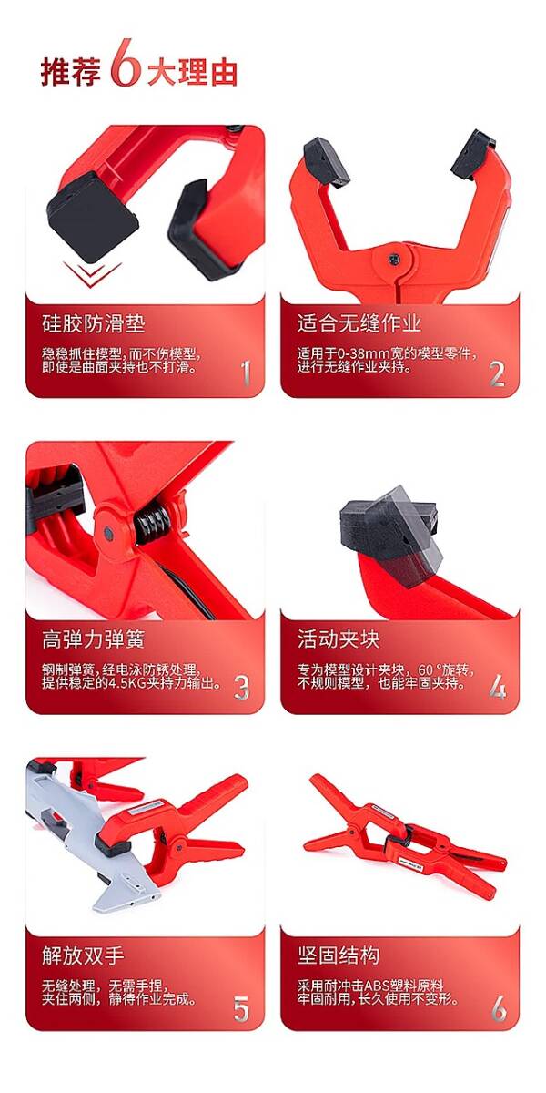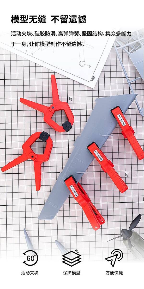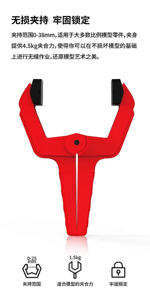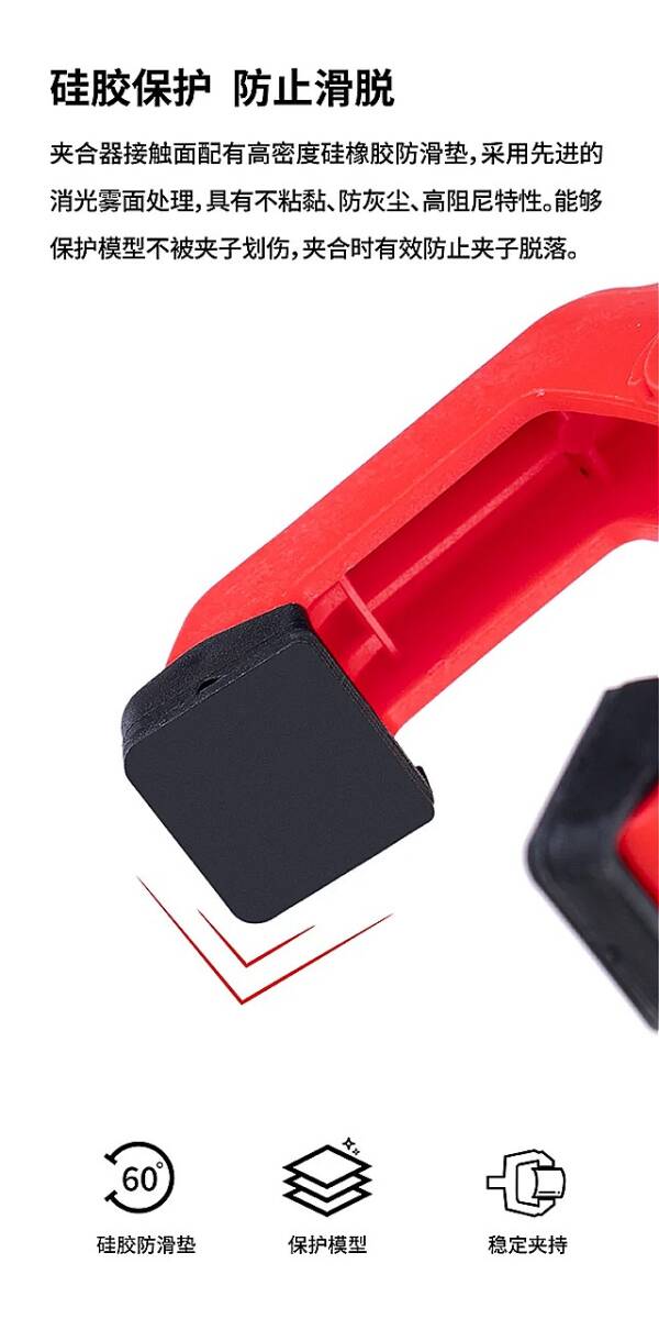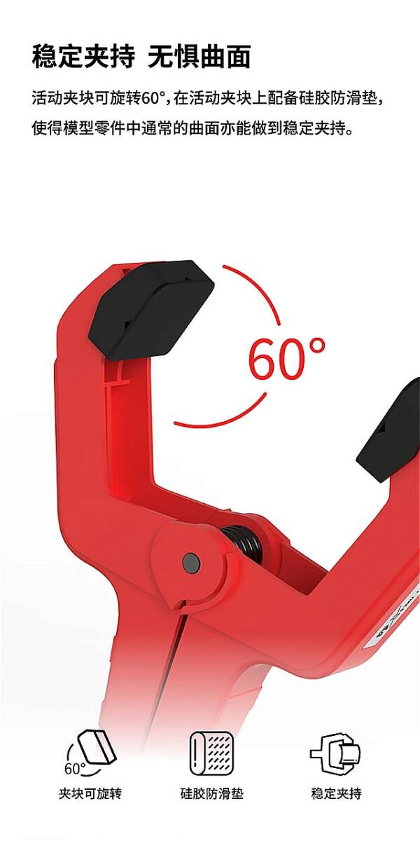 模型製作用に最適なクランプです。洗濯バサミに似た形状ながら、上下垂直に近い方向から圧迫するため、円形のパーツも弾くことなくしっかり挟みます。また、パーツとの接触部分はシリコンでカバーされ60°まで可動し、滑り防止・キズ付け防止となっています。