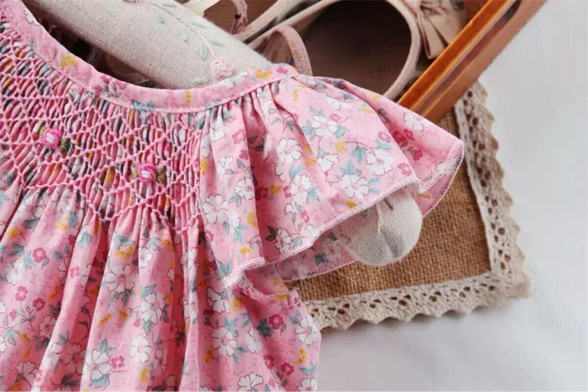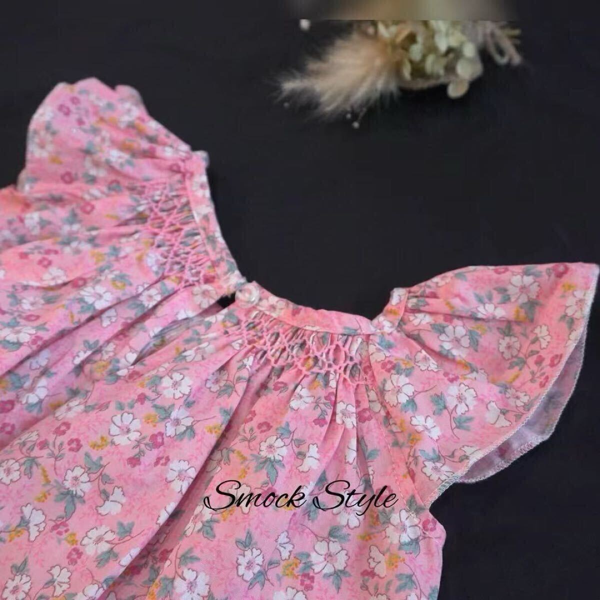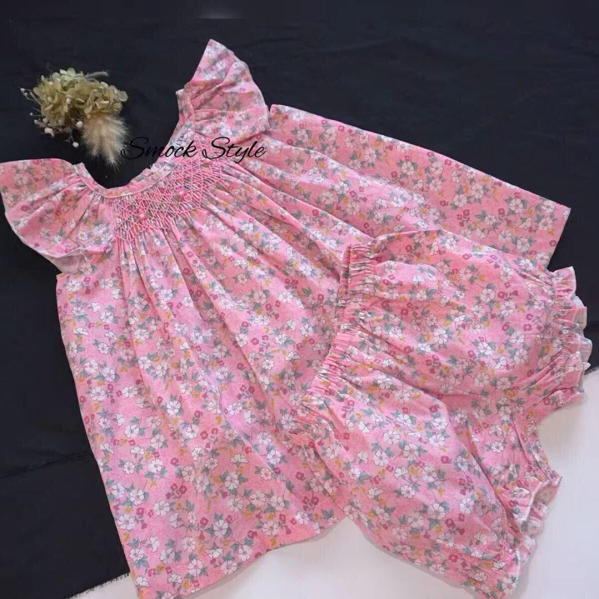 ・柔らかい 小花柄の生地を使用した女の子用スモッキングセットアップ^ ^ ・ゆったりサイズでワンピース、トップスとして使い頂けます! ・胸元の豪華なスモッキング刺繍は職人により一枚一枚施されました。