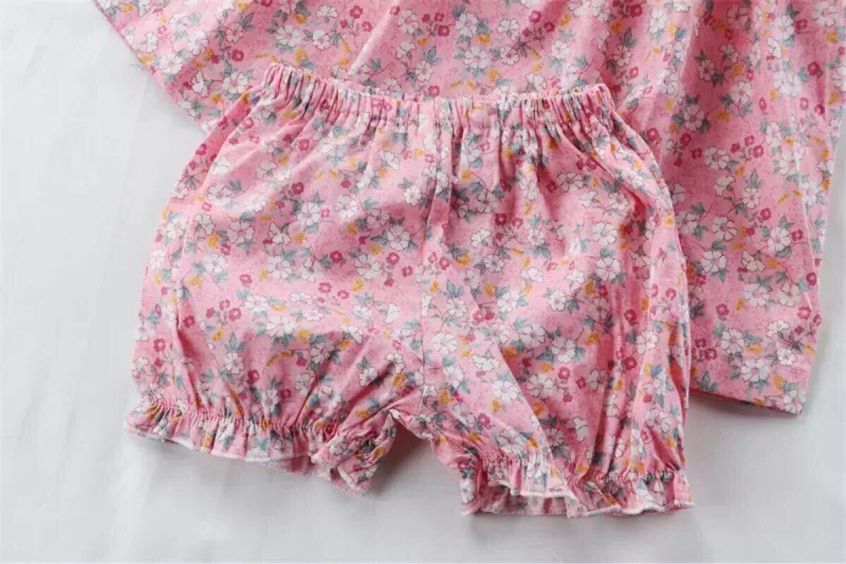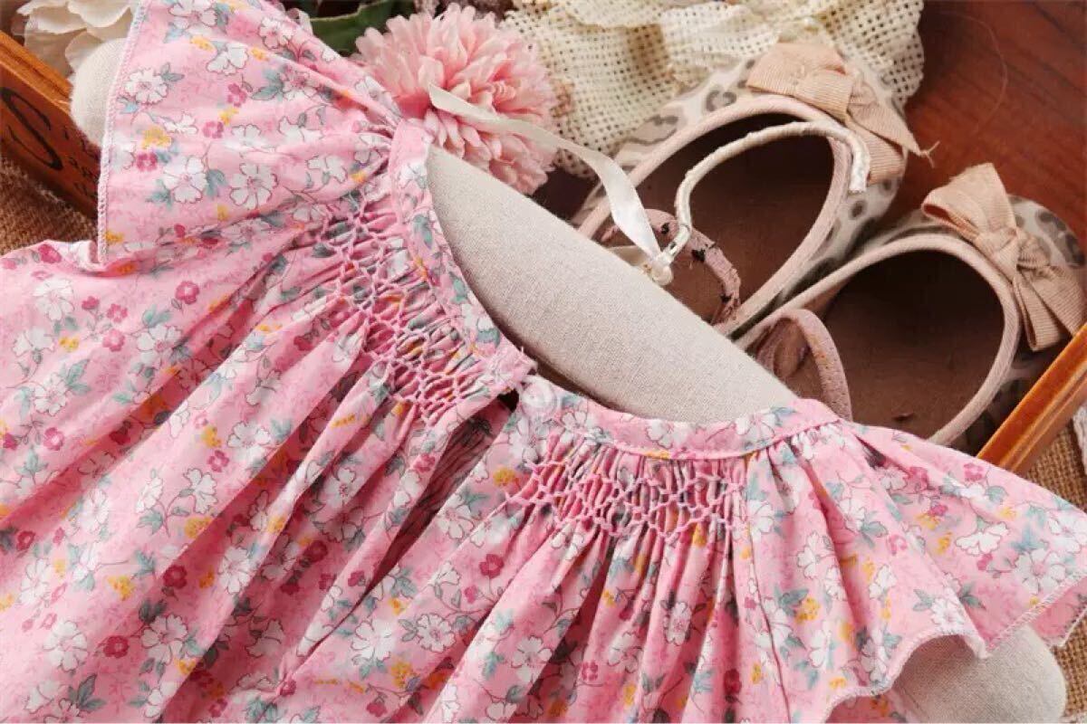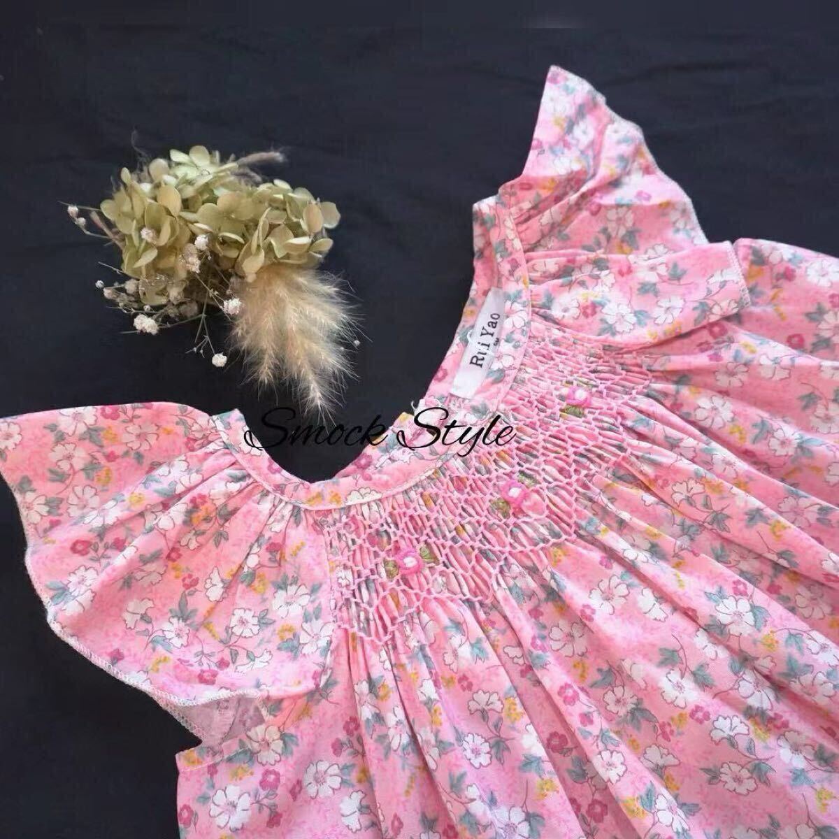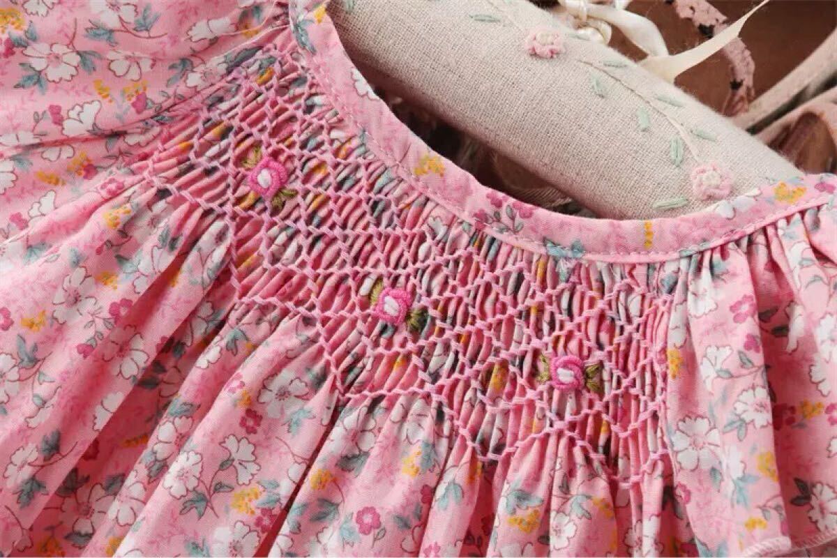 ・柔らかい 小花柄の生地を使用した女の子用スモッキングセットアップ^ ^ ・ゆったりサイズでワンピース、トップスとして使い頂けます! ・胸元の豪華なスモッキング刺繍は職人により一枚一枚施されました。