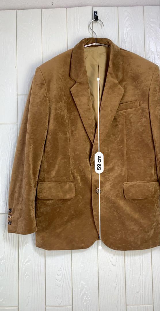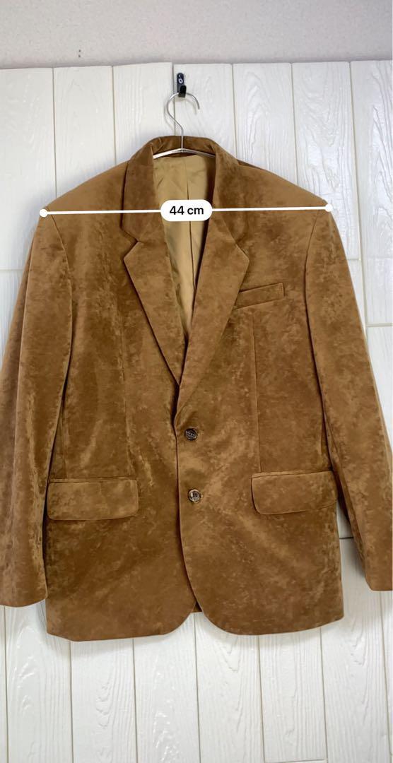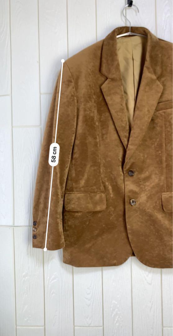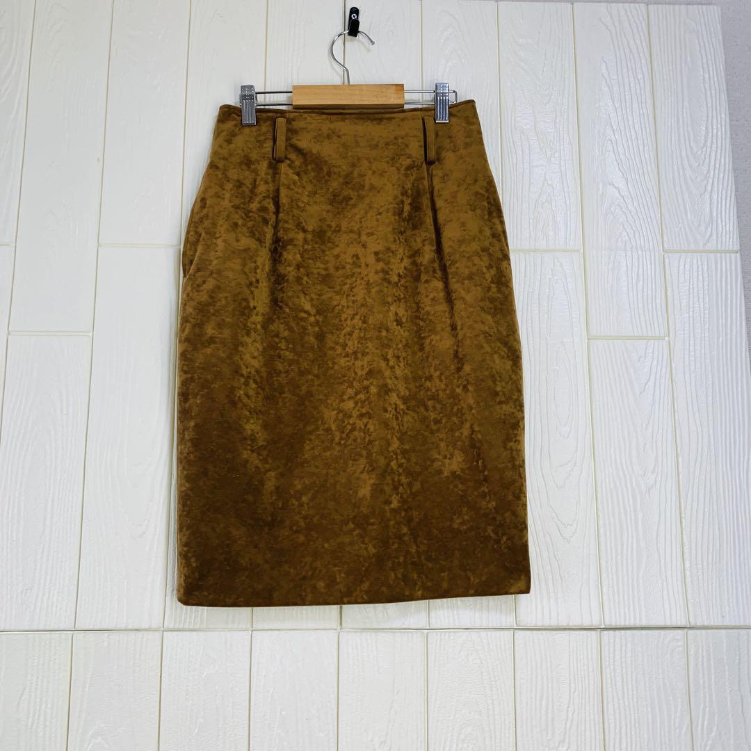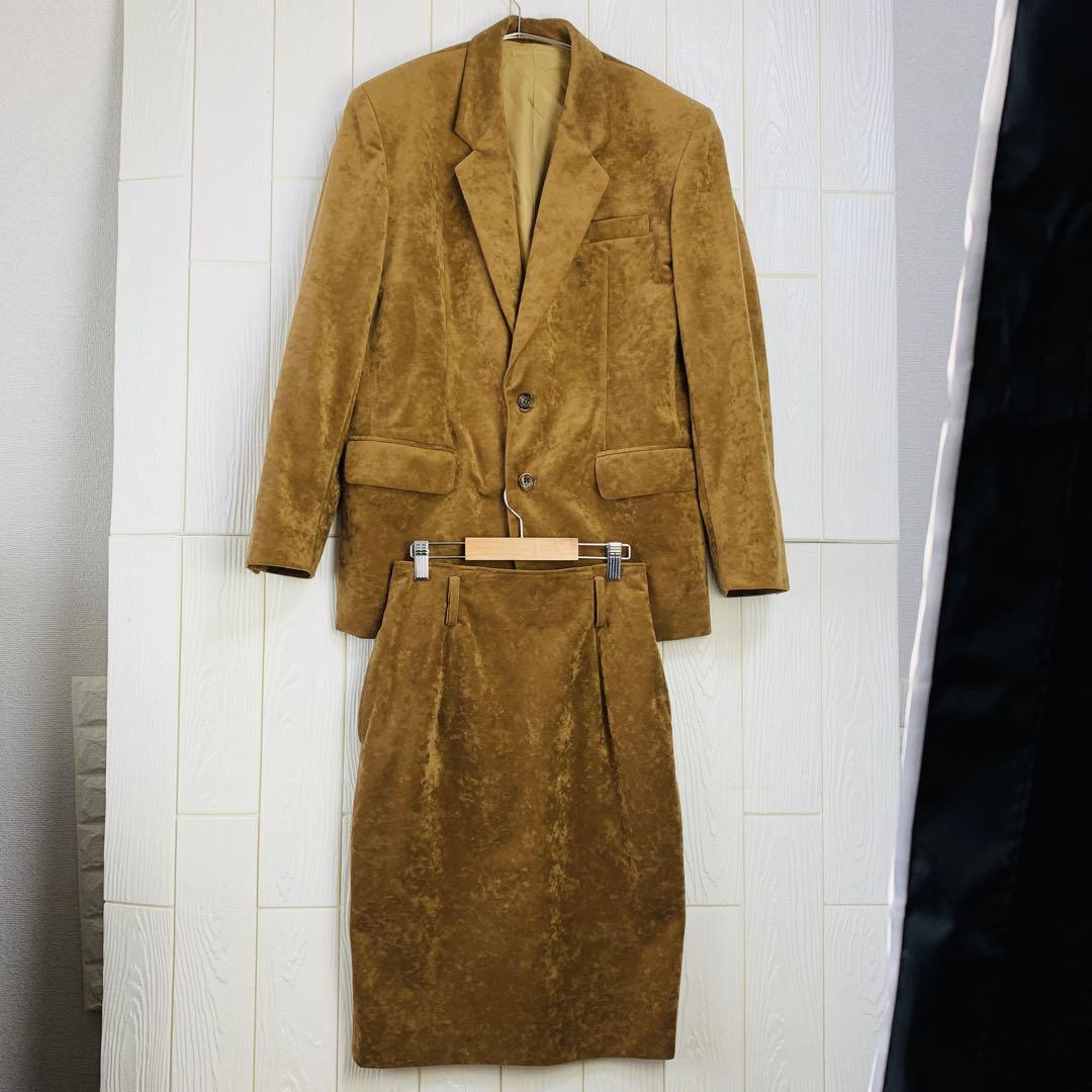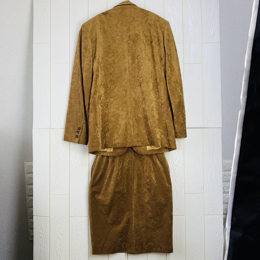 ブラウンのスエード素材のシングルブレストスカートスーツ セットアップ。