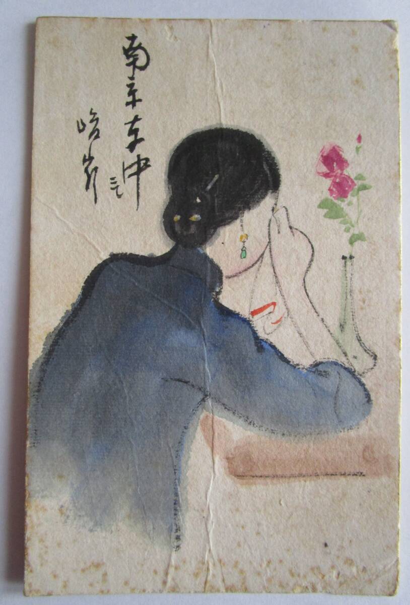 手彩色清国美人絵の私製葉書の切手面に旧大正毛紙1・5銭貼・黒欧文櫛型派生金属印KIUKIANG・23・5・21消(画像3参照)→京都市新