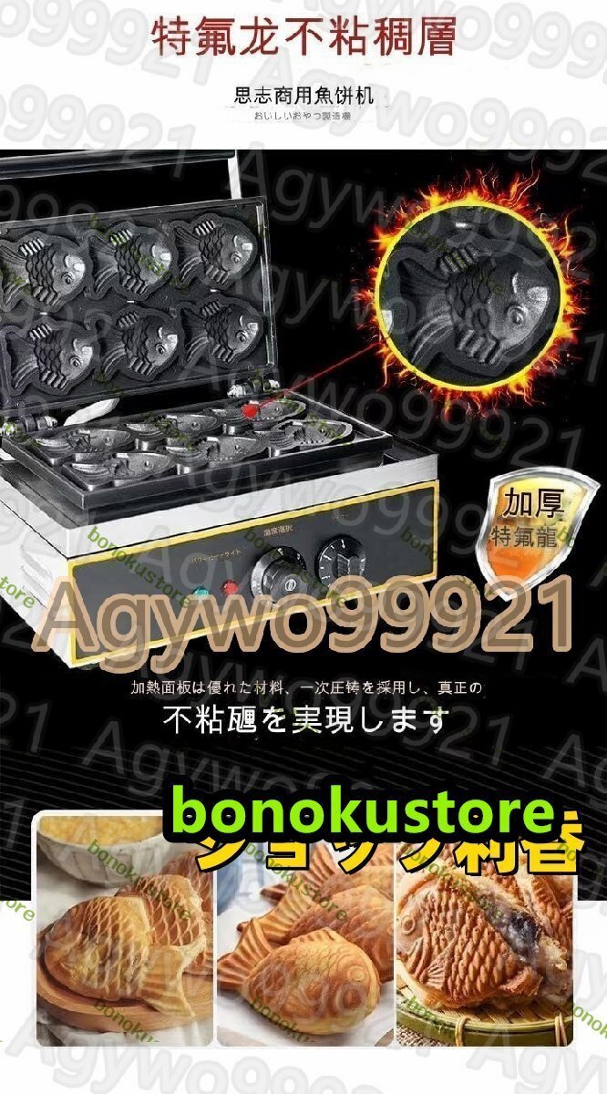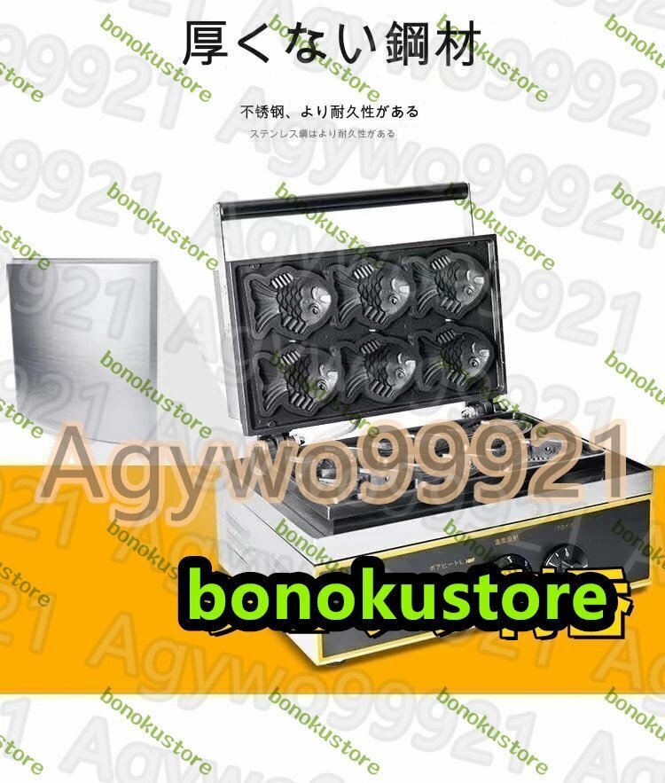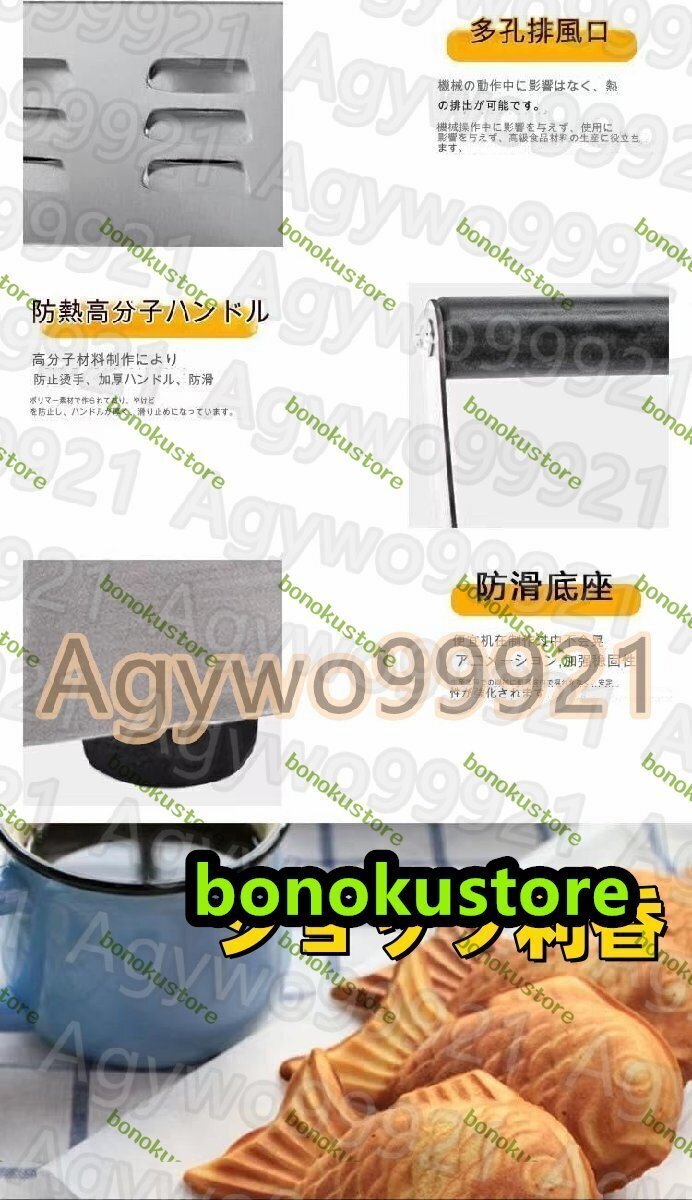 商品の説明商品の説明この業務用ホットサンド・ワッフルメーカーは、のどかな日本の風景を思わせるデザインの鯛焼き器です。金魚がモチーフで、一度に6匹の小さな金魚を焼くことができます。電動式で操作も簡単で、食材を挟んで焼くだけで、おいしい鯛焼きを楽しめます。鯛焼き器としてだけでなく、ホットサンド・ワッフルとしても利用できるので、メニューのバリエーションが広がります。これは、お店や家庭で使うのに最適な鯛焼き器です。