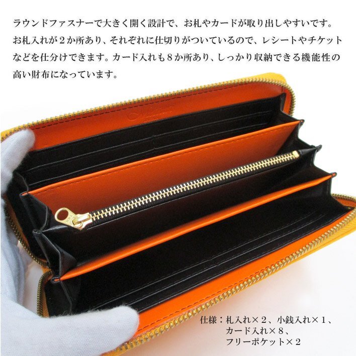 | ラウンドファスナーで大きく開く設計で、お札やカードが取り出しやすいです。 お札入れが2か所あり、それぞれに仕切りがついているので、レシートやチケットなどを仕分けできます。 カード入れも8か所あり、しっかり収納できる機能性の高い財布になっています。 アルカンターラ生地で触り心地が良く、高級感があります。 表側の素材は、スーパーカーや高級車の内装にも使用されているアルカンターラという、クルマ好きには高級内装素材として知られている人工革です。 スエードに似た高級感ある見た目ですが、より耐久性や耐光性、水もはじきやすく、難燃性が極めて優れていると同時に肌触りの良い素材です。 液体の吸収力が低く、水に濡れても乾けば元通りの風合いを取り戻します。汚れ落としが簡単です。 耐久性に優れているので長年お使いいただけます。人と違ったものを持ちたい方にオススメです。 誕生日プレゼント・クリスマス・バレンタイン・父の日・母の日などの贈り物にも最適です。 ■カラー:ORANGE(オレンジ) ■素材:外側 アルカンターラ、内側 牛革 ■サイズ(約):横19.5cm×縦11cm×マチ3.5cm ■重量:約200g ■仕様:札入れ×2、小銭入れ×1、カード入れ×8、フリーポケット×2 ※一部共通画像使用 ※ご注意※革は自然が造り出した理想的な繊維です。 自然由来の素材のため革には細かなシワや傷跡・トラ等が存在する場合があります。 これらは本革である証拠であり、革本来の特長であり、魅力でもあります。 ※新品ではございますが製造上の過程により商品によっては細かな傷やへこみ、剥げ等がある場合が御座います。 また、多少の縫製のゆがみ・ノリの付着がある場合がございます。 ※ご覧のモニターやプラウザの設定、照明等により、画像と実物の色合いが、若干異なる場合が御座います。 予めご理解頂いた上でご購入下さい。 | |
