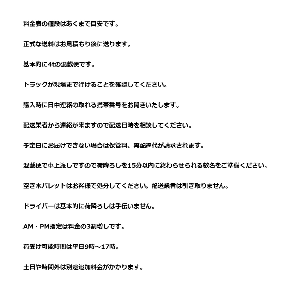 混載便で車上渡しですので荷降ろしを15分以内に終わらせられる数名をご準備ください。