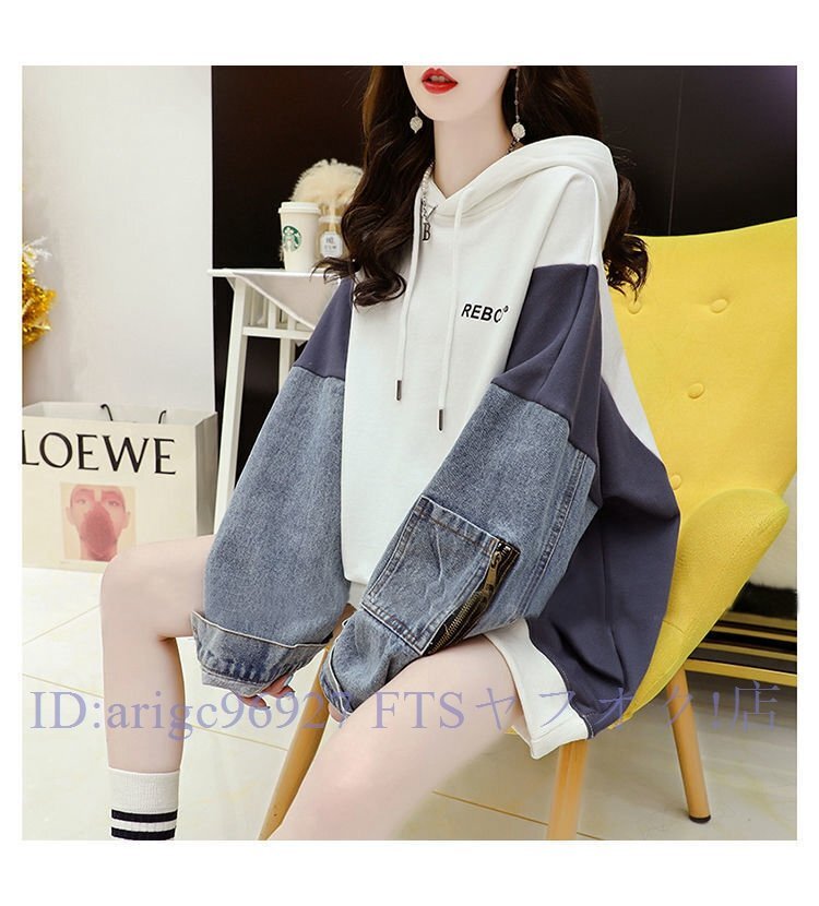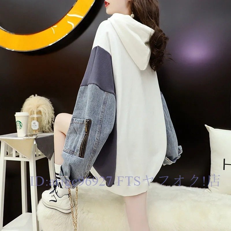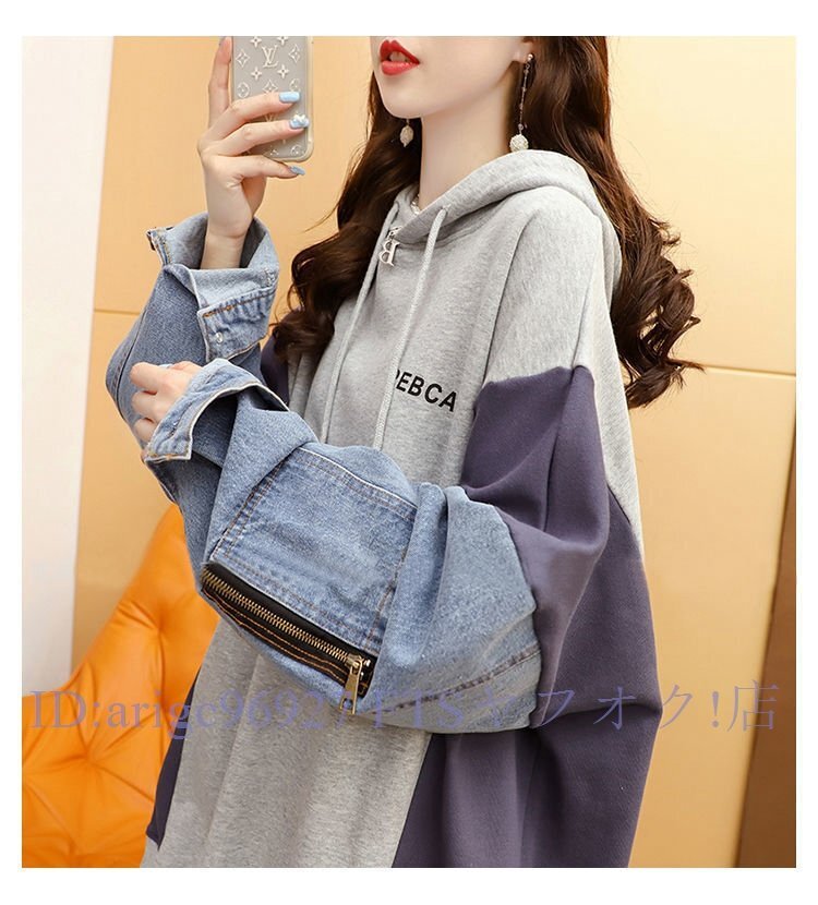 B3186レディース トレーナー 春秋 ゆったり 可愛い 長袖 袖デニム 薄手 フード付き 大きいサイズ カジュアル おしゃれ 2色M-2XL