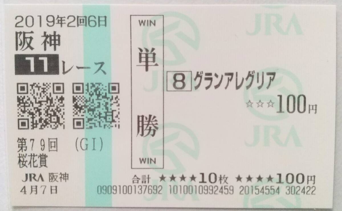 2019年桜花賞、グランアレグリアの現地的中単勝馬券(額面100円)です。経年劣化、印字薄等を気になさる方の入札はご遠慮ください。送料として普通郵便110円のご負担をお願いします。郵送事故等の責任は負いかねます。ノークレーム、ノーリターンでお願いします。