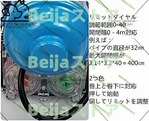巻上モーター:リミットダイヤルで回転数を0-40調節、開閉幅0-4m対応。トルク100N.m、最大巻き上げるパイプの長さ110m。回転速度:4rpm。