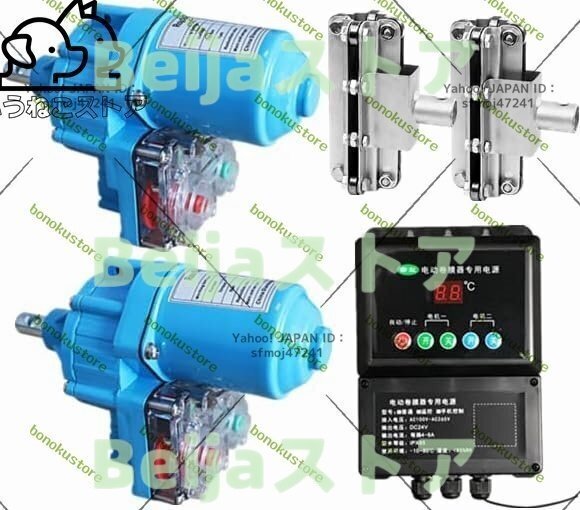 制御器:AC110VコンセントとDC24Vモーターを連接、制御器にあるスイッチを操作で、高所のモーターを制御、ビニールハウスの巻上パイプの巻上、巻き下げをコントロール。     【温度制御】:温度センサー付き、設定した温度より、自動にビニールハウスを開閉。注意:制御器の外形の様子が在庫より異なり、ご了承ください。
