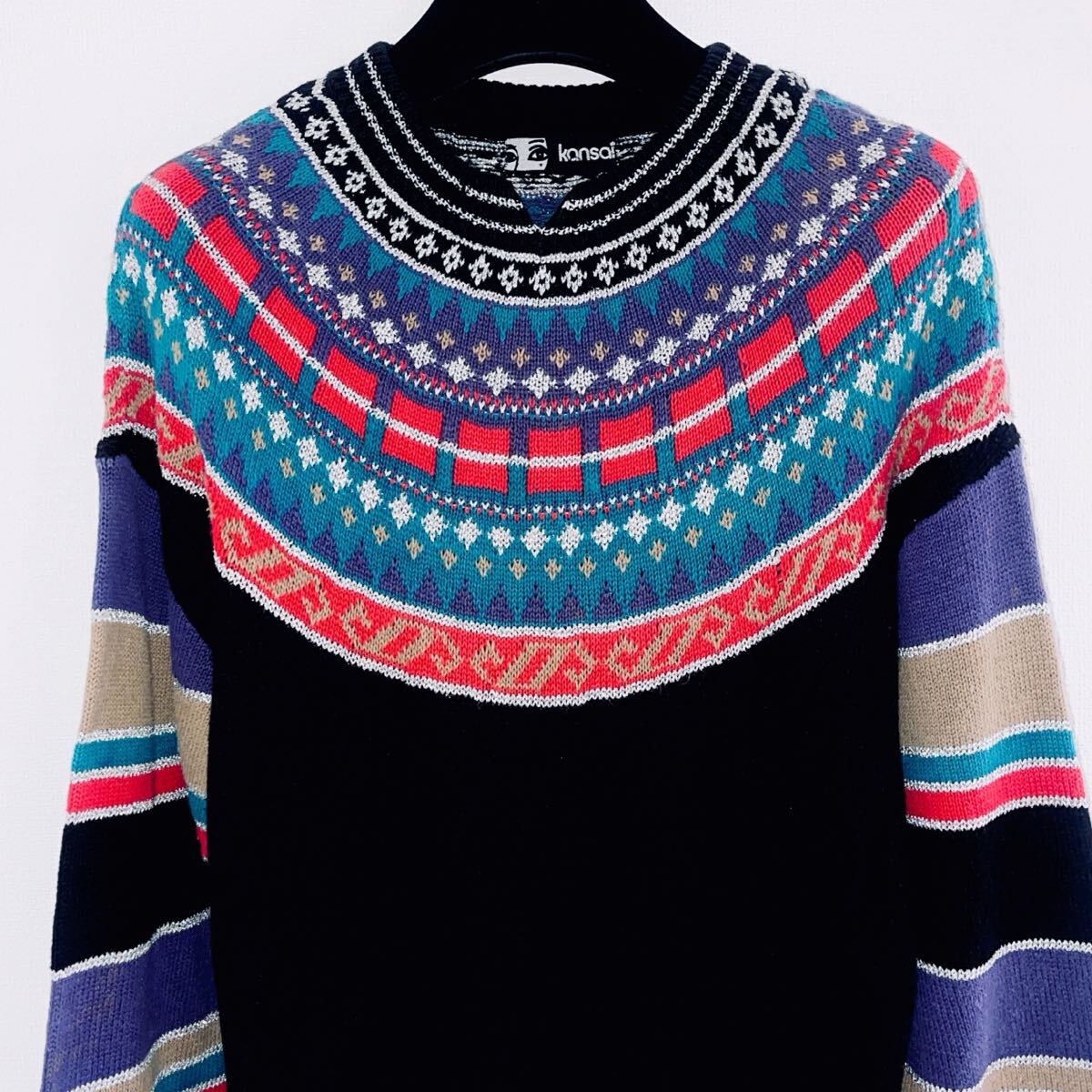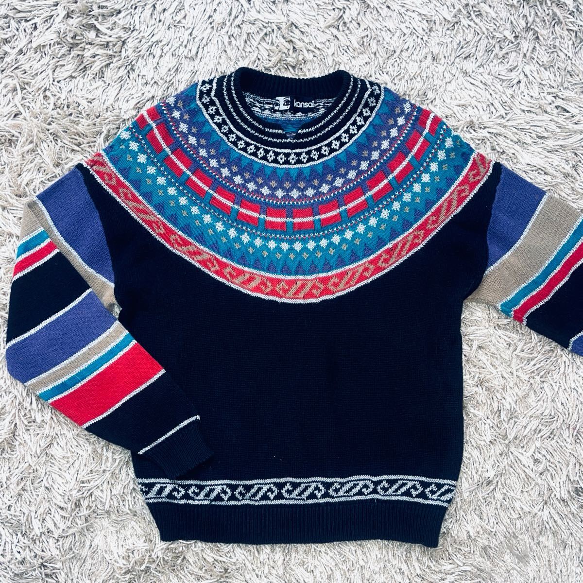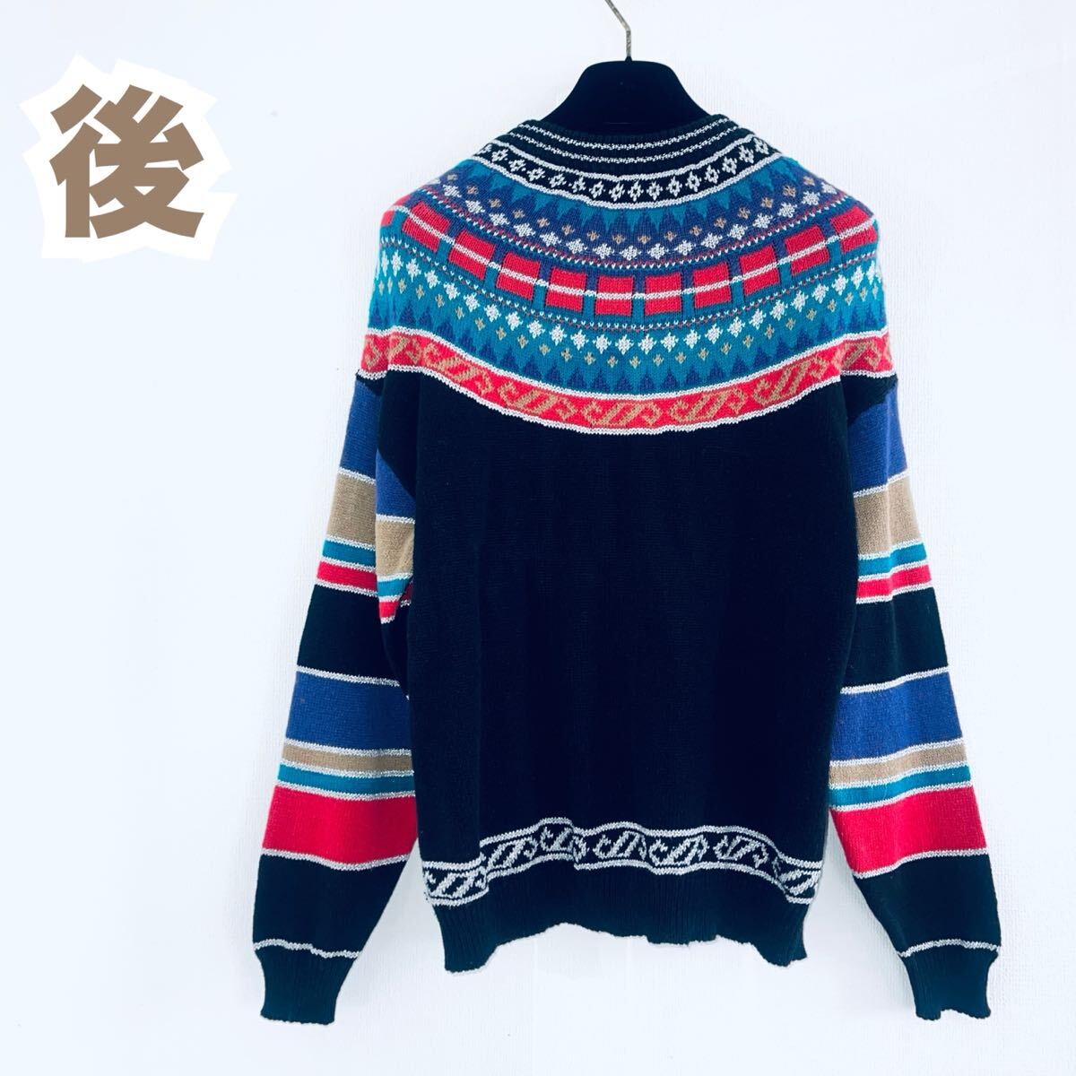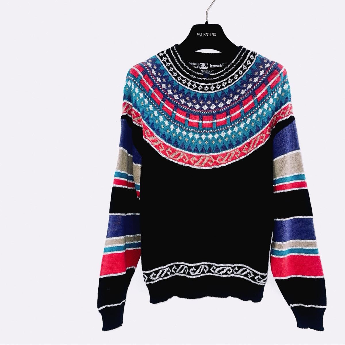 「山本寛斎」の長袖セーター。複雑な編込み柄の丸ヨークデザインです。