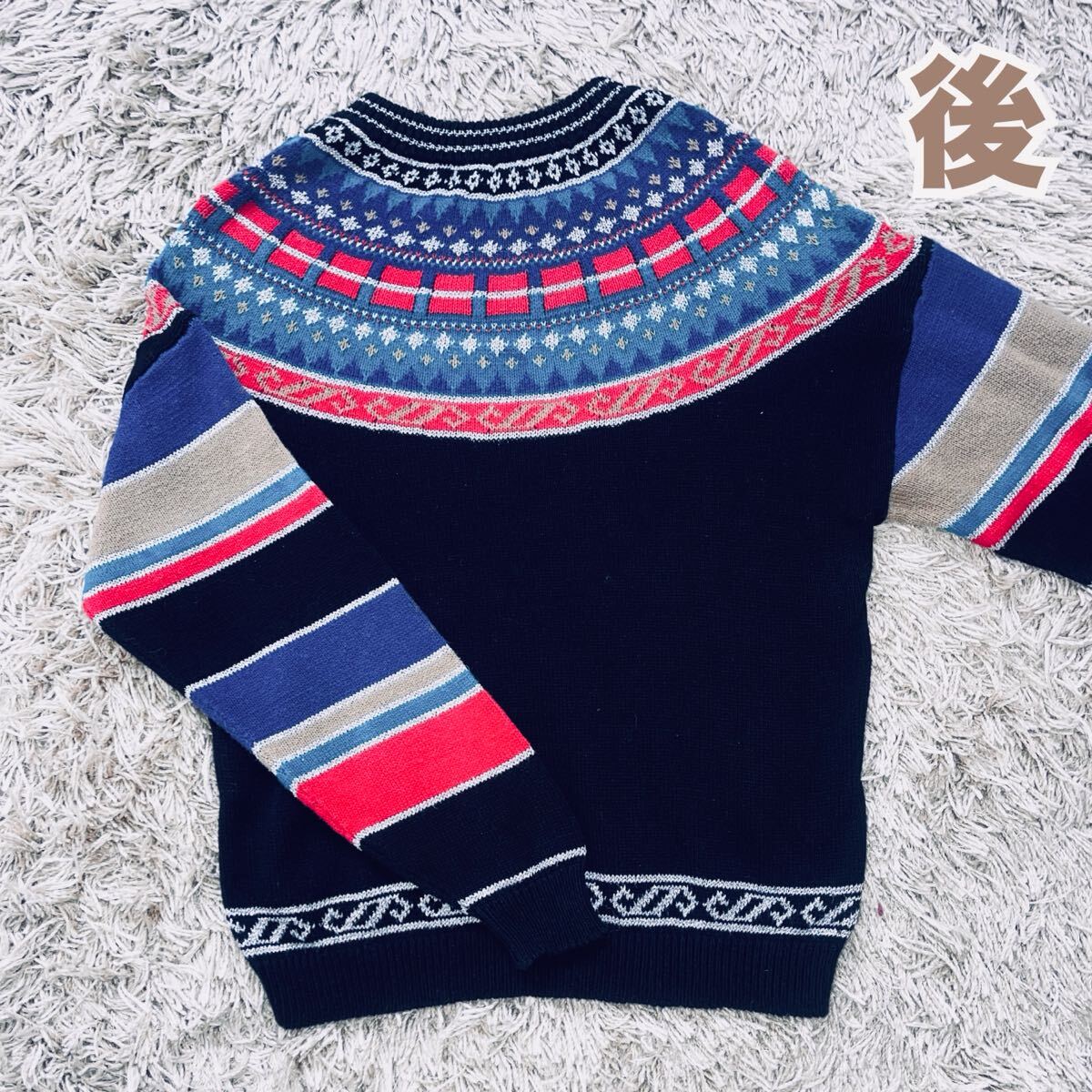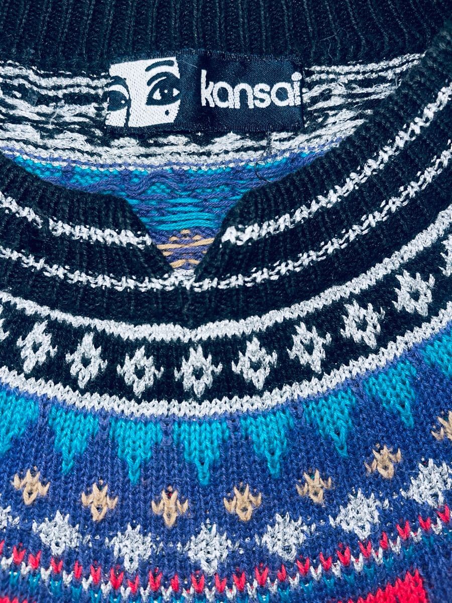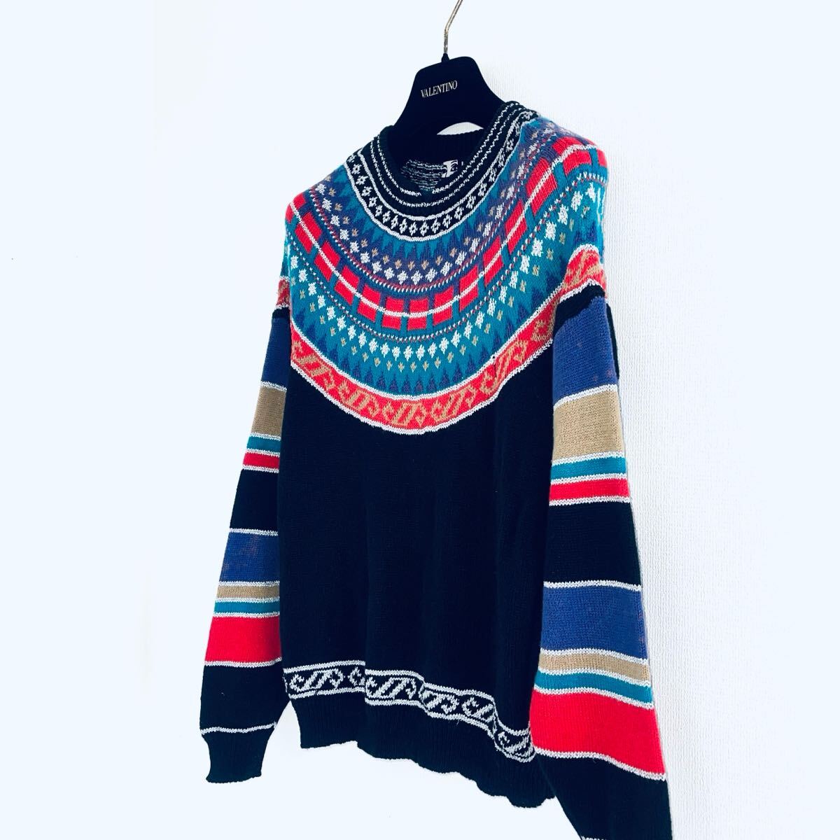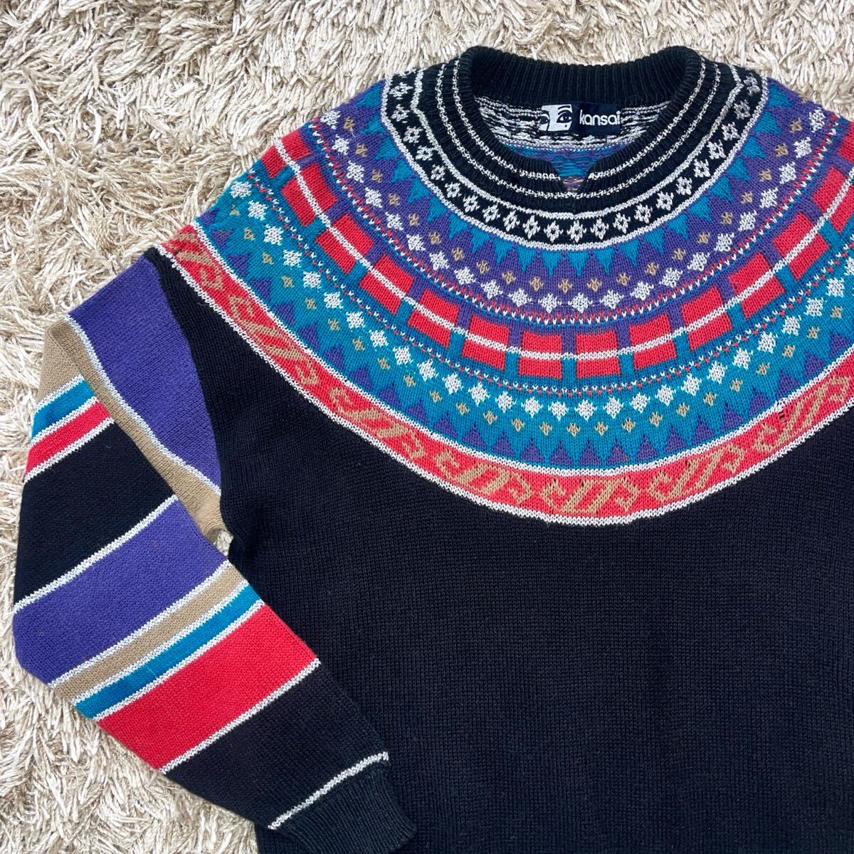「山本寛斎」の長袖セーター。複雑な編込み柄の丸ヨークデザインです。