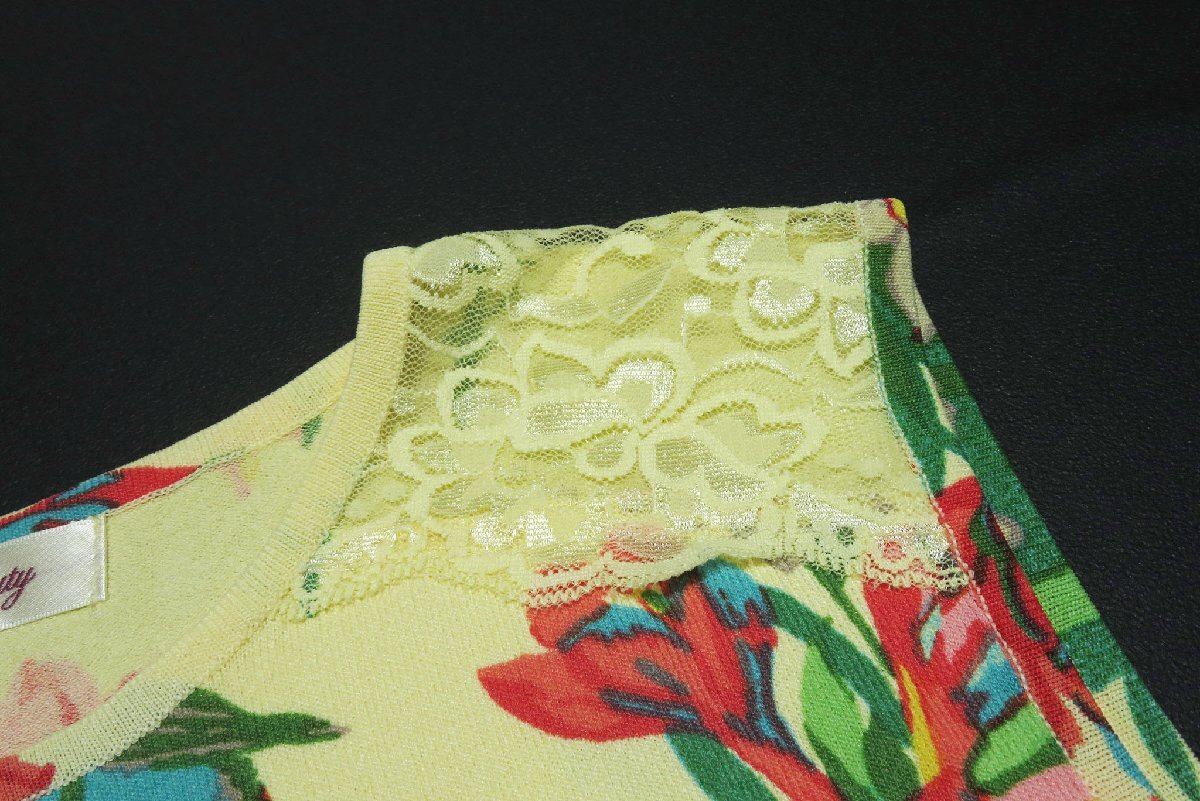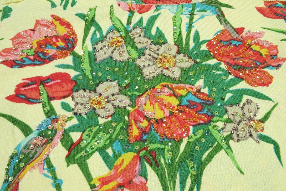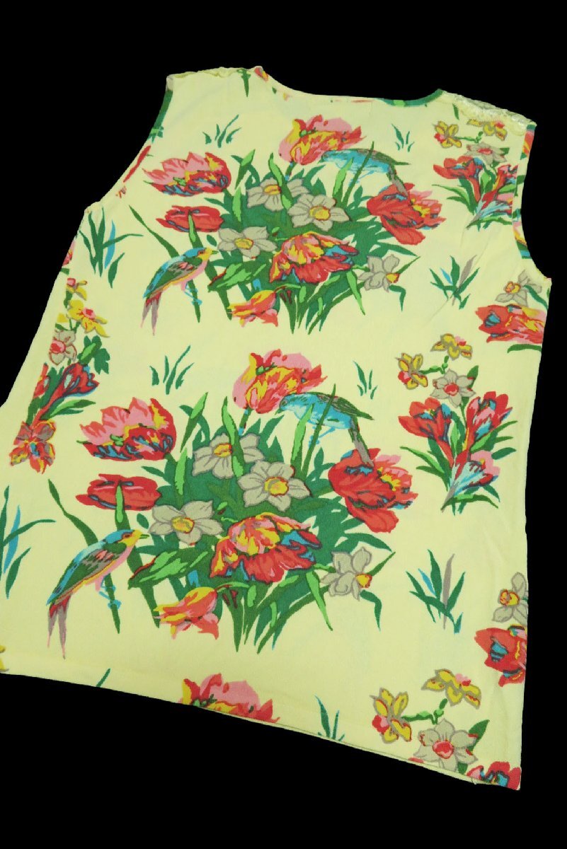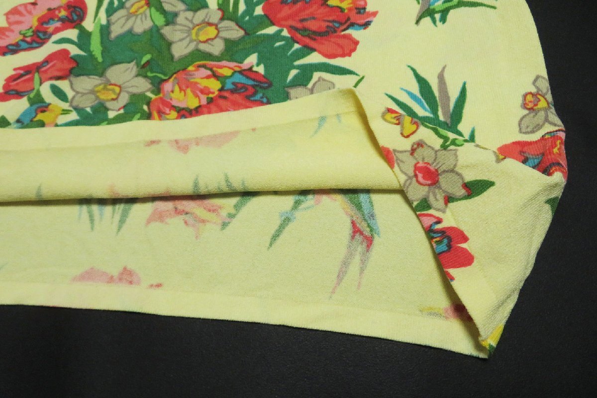 艶のある化繊ニットでお色は黄色に赤や緑のお花柄がプリントされています。