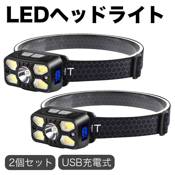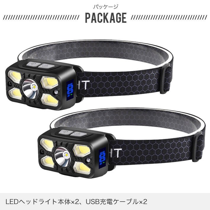 パッケージ内容:LEDヘッドライト本体×2、USB充電ケーブル×2