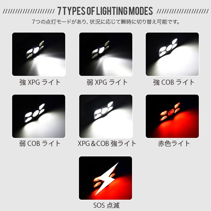 強XPGライト、弱XPGライト、強COBライト、弱COBライト、XPG&COB強ライト、赤色ライト、SOS点滅の7つの点灯モードがあり、状況に応じて瞬時に切り替え可能です。