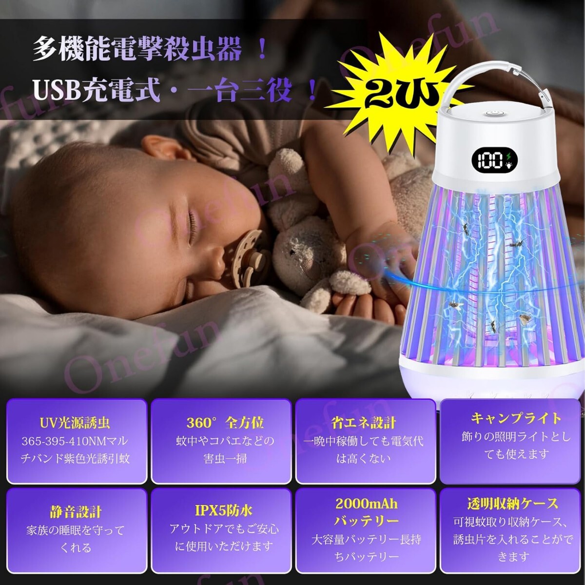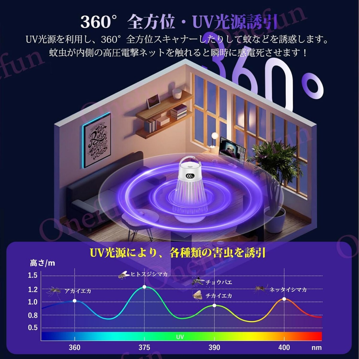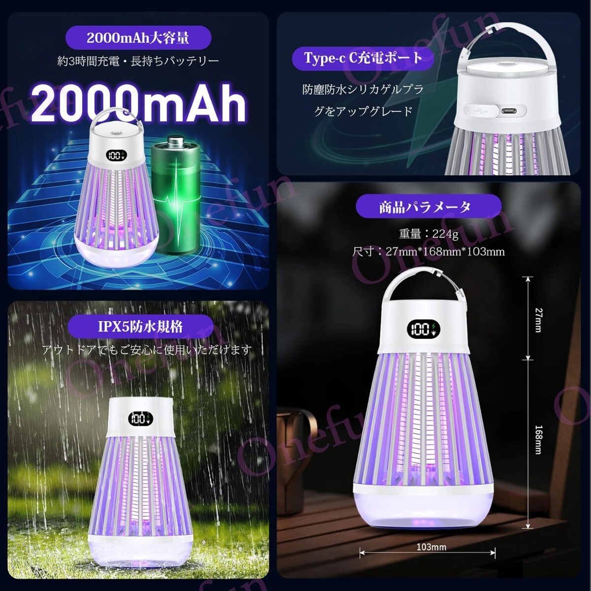 電撃殺虫器【2024年夏新モデル】Onefun 電撃殺虫機 コバエ取り 虫除け 捕虫器 電気蚊取り器 殺虫機 LED誘虫灯 UV光源吸引式 蛾 蚊 コバエ 駆除 電撃 360°強力蚊除け 殺虫ライト 静音設計 省エネ経済 薬剤不用 USB充電式 大容量2000mAh IPX5防水 LEDランプ照明 多機能 電撃殺虫灯 吊り下げ式&据え置き式両用 屋外/屋内などに適用 日本語説明書付き (ホワイト)