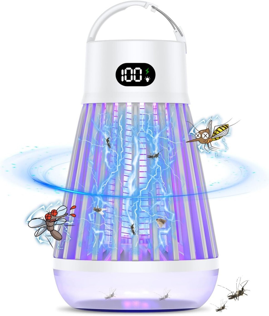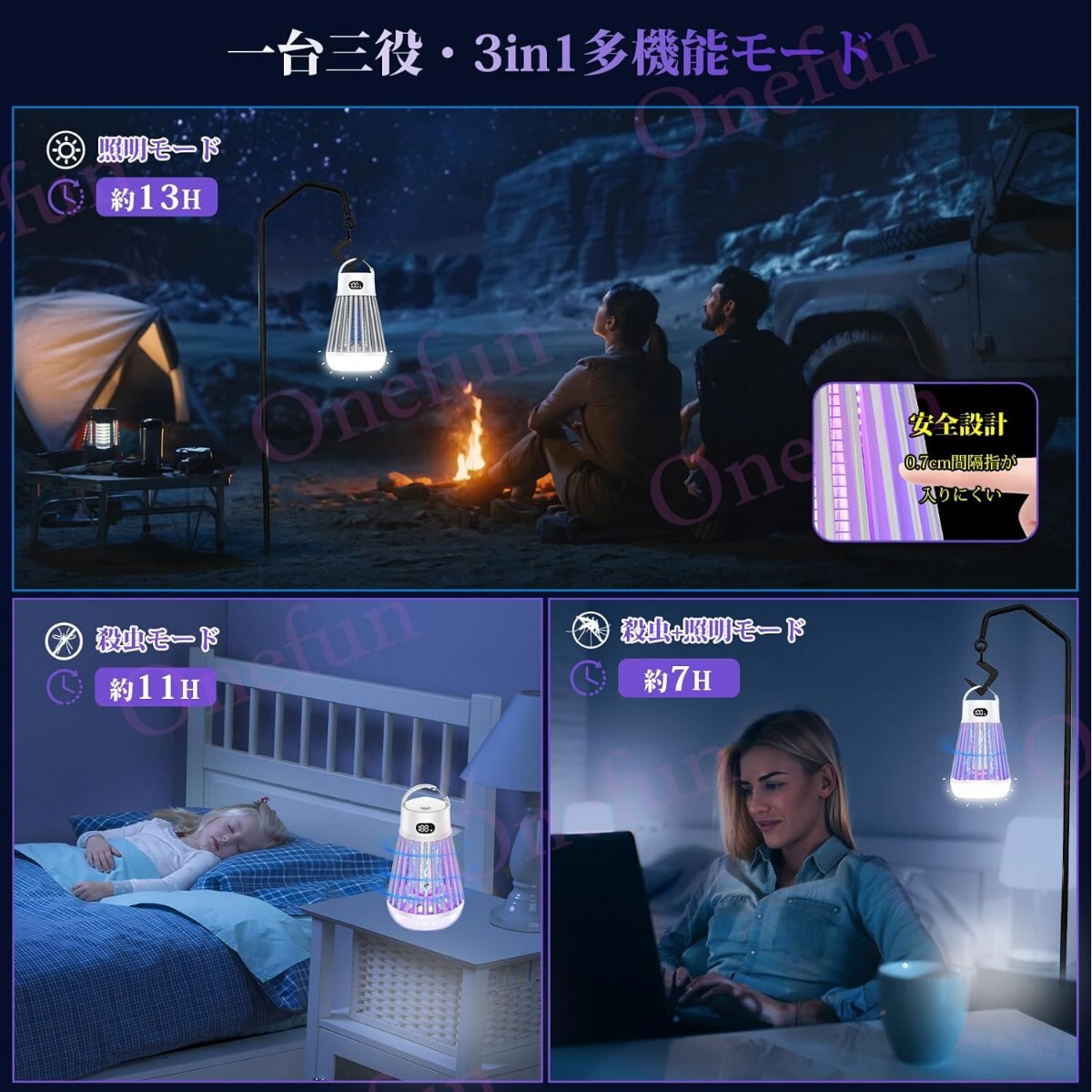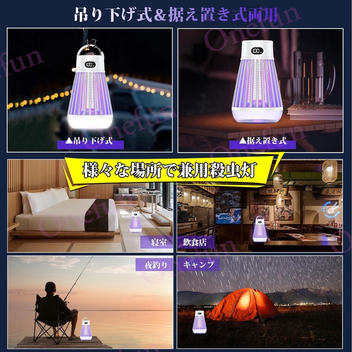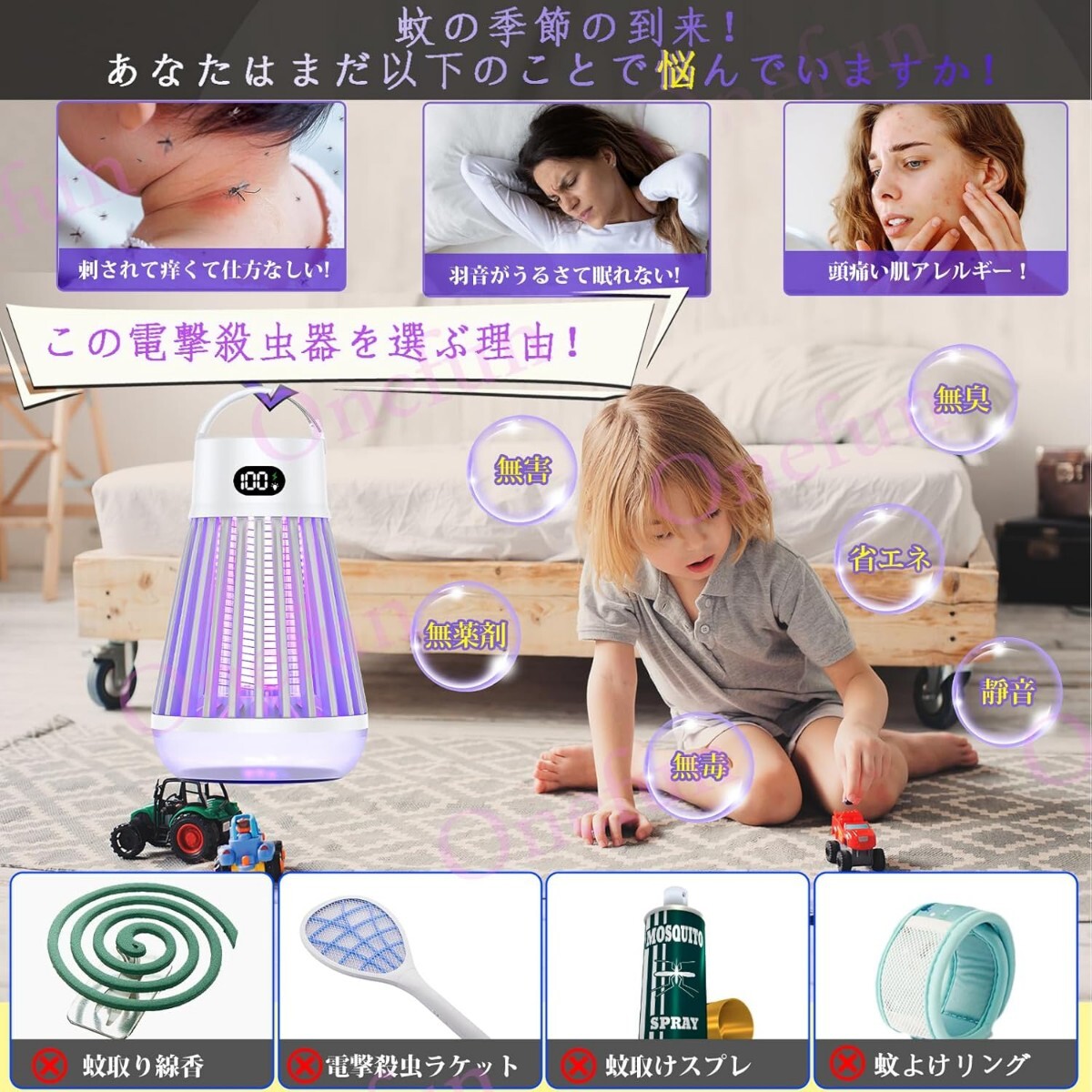 電撃殺虫器【2024年夏新モデル】Onefun 電撃殺虫機 コバエ取り 虫除け 捕虫器 電気蚊取り器 殺虫機 LED誘虫灯 UV光源吸引式 蛾 蚊 コバエ 駆除 電撃 360°強力蚊除け 殺虫ライト 静音設計 省エネ経済 薬剤不用 USB充電式 大容量2000mAh IPX5防水 LEDランプ照明 多機能 電撃殺虫灯 吊り下げ式&据え置き式両用 屋外/屋内などに適用 日本語説明書付き (ホワイト)