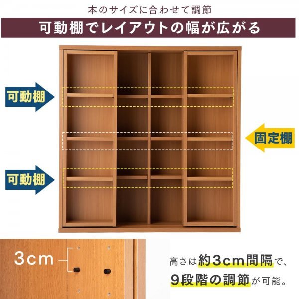 ・高さを選べる可動棚で、収納するものに合わせたカスタマイズが可能です。お好みの高さに調節できるため、大きな本やコミックも楽に収納できます。