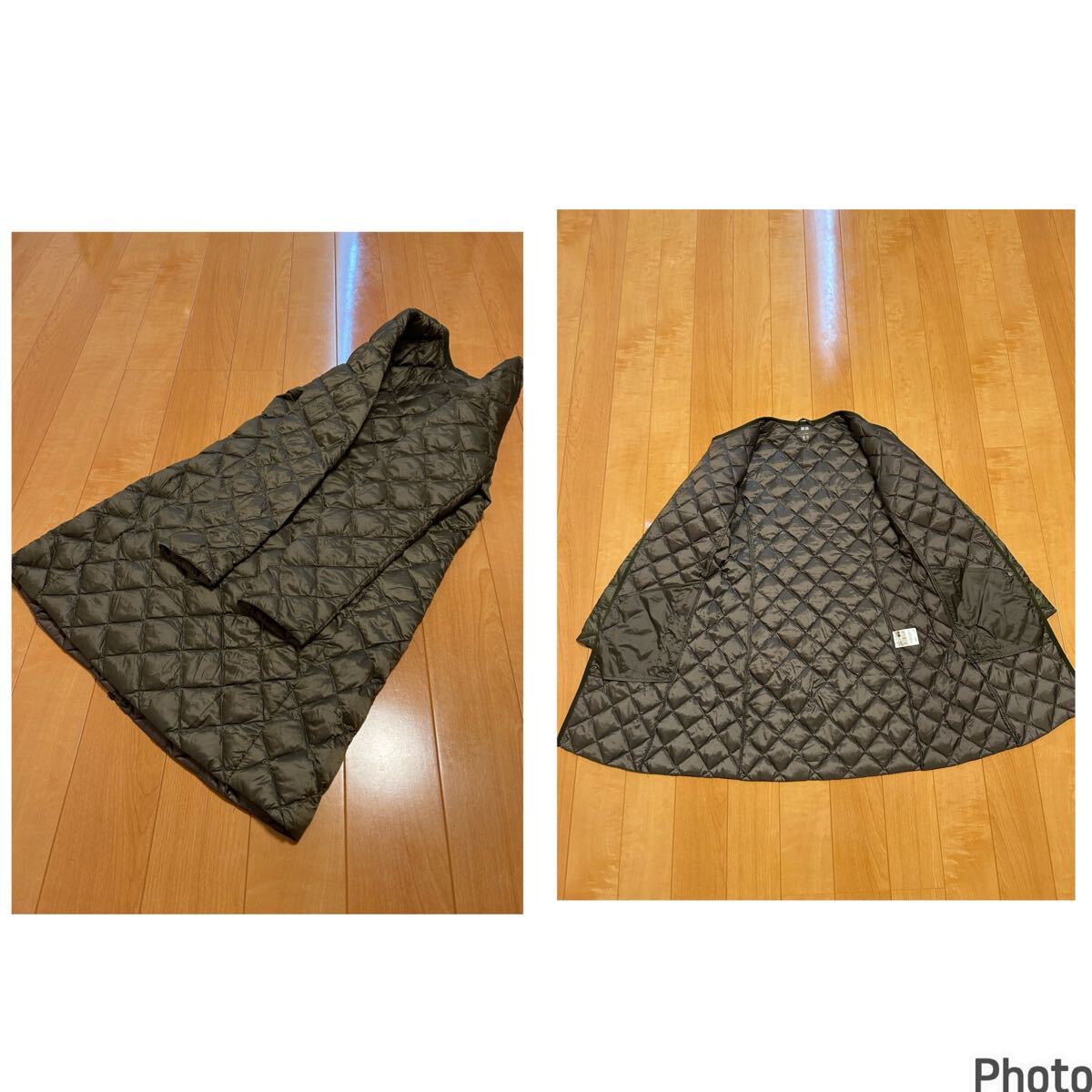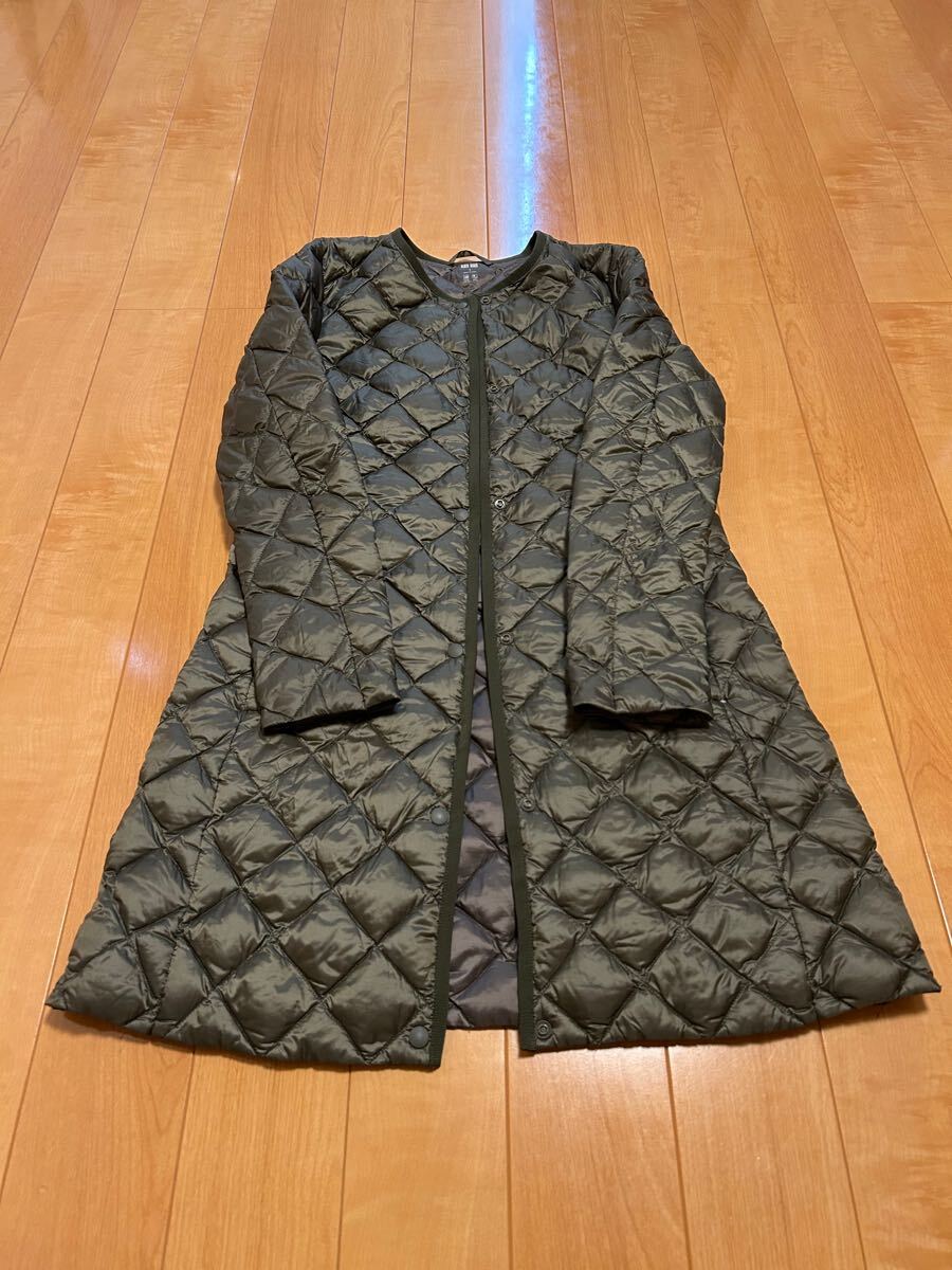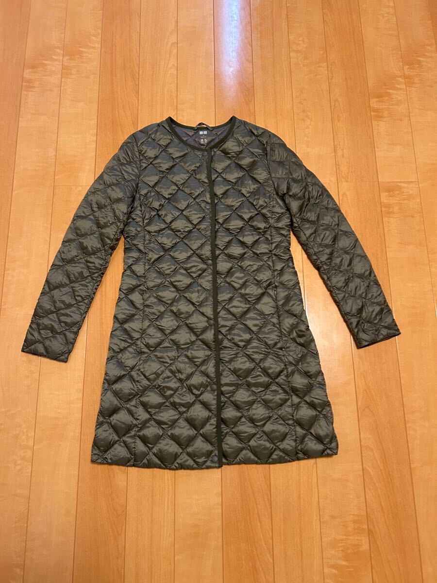 着用少な目.美品☆ユニクロ レディースサイズS 超軽量&高密度ライトダウンロングコート・襟無ノーカラー&ダイヤキルティングナイロン 深緑