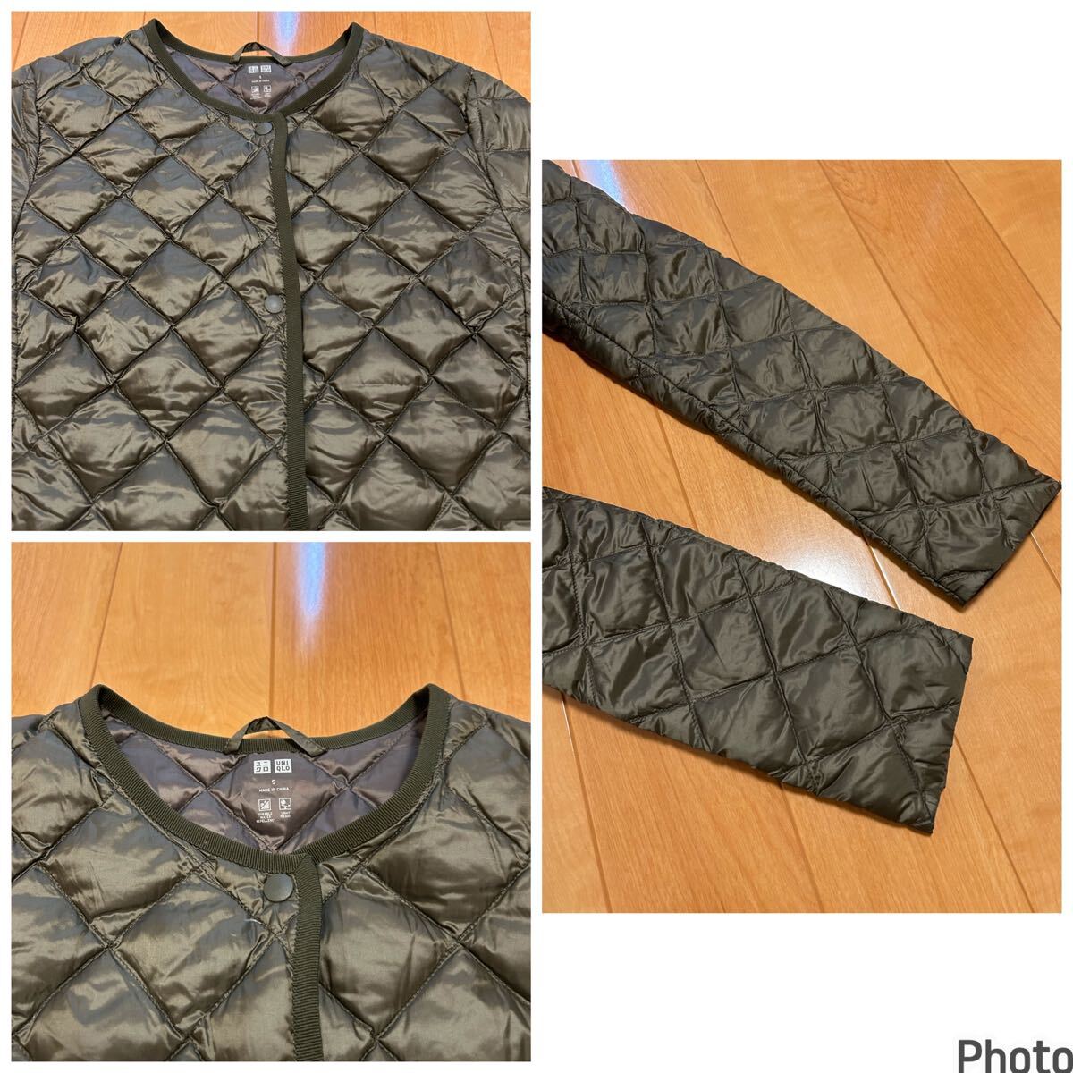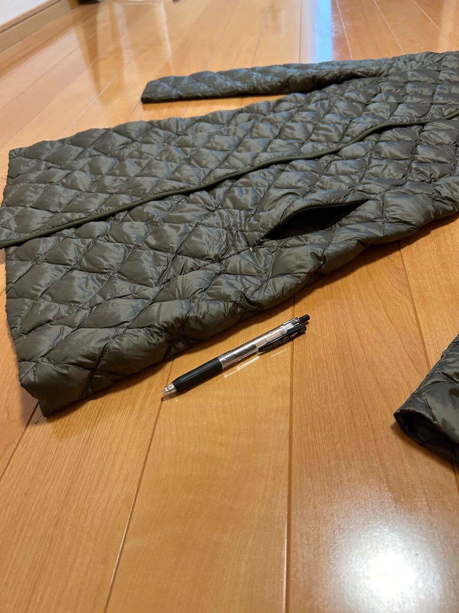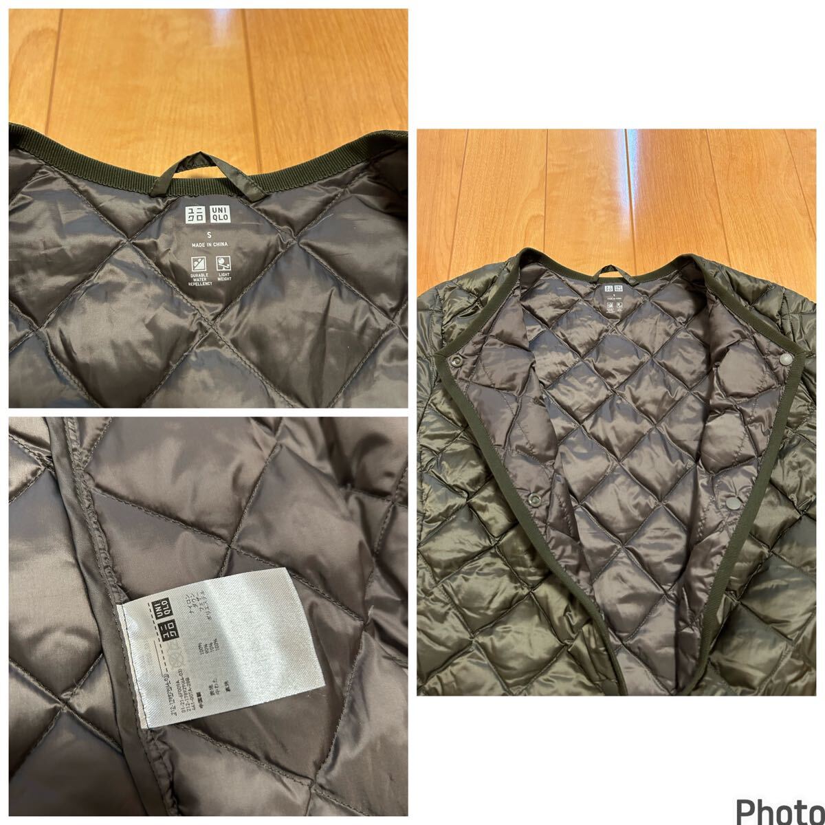 着用少な目.美品☆ユニクロ レディースサイズS 超軽量&高密度ライトダウンロングコート・襟無ノーカラー&ダイヤキルティングナイロン 深緑
