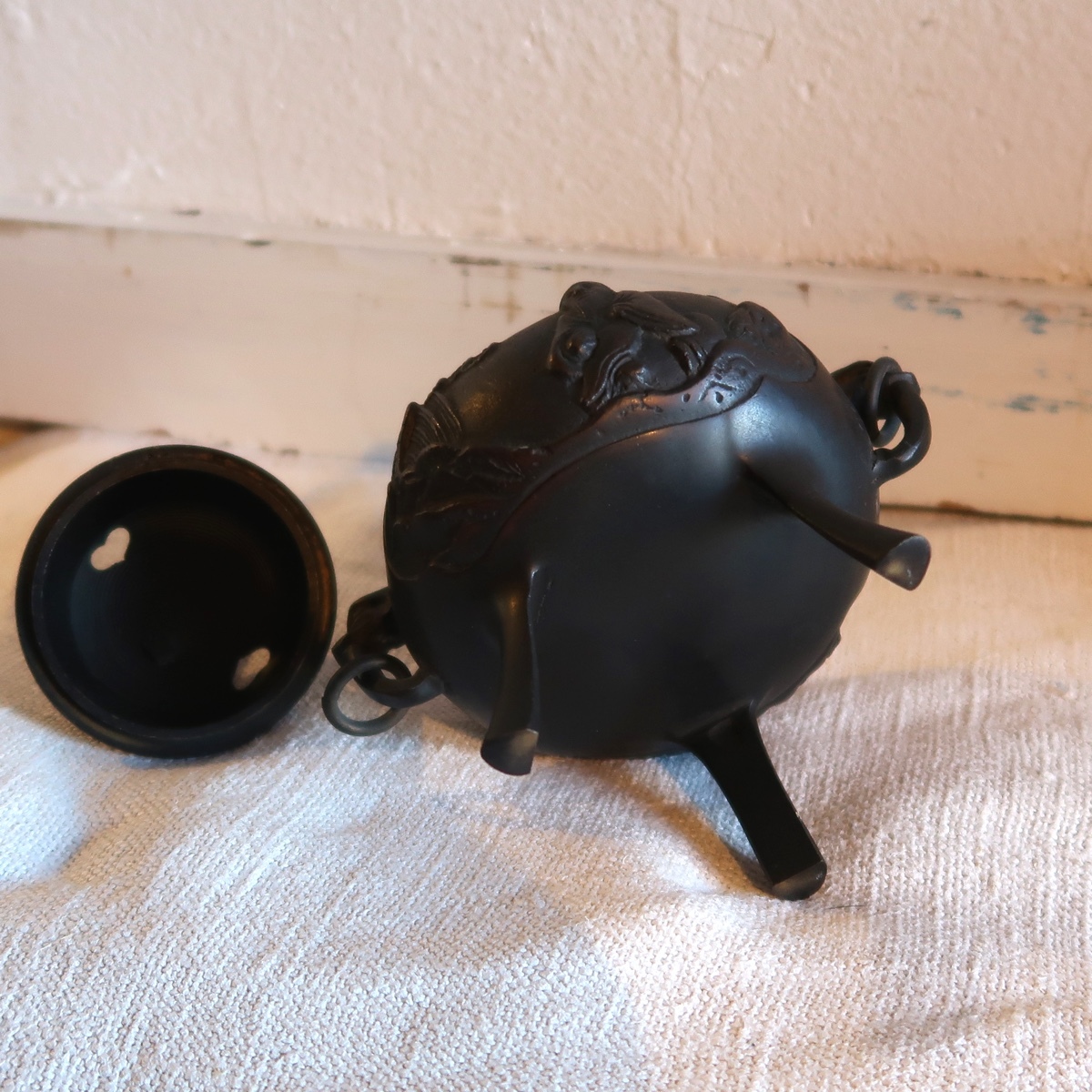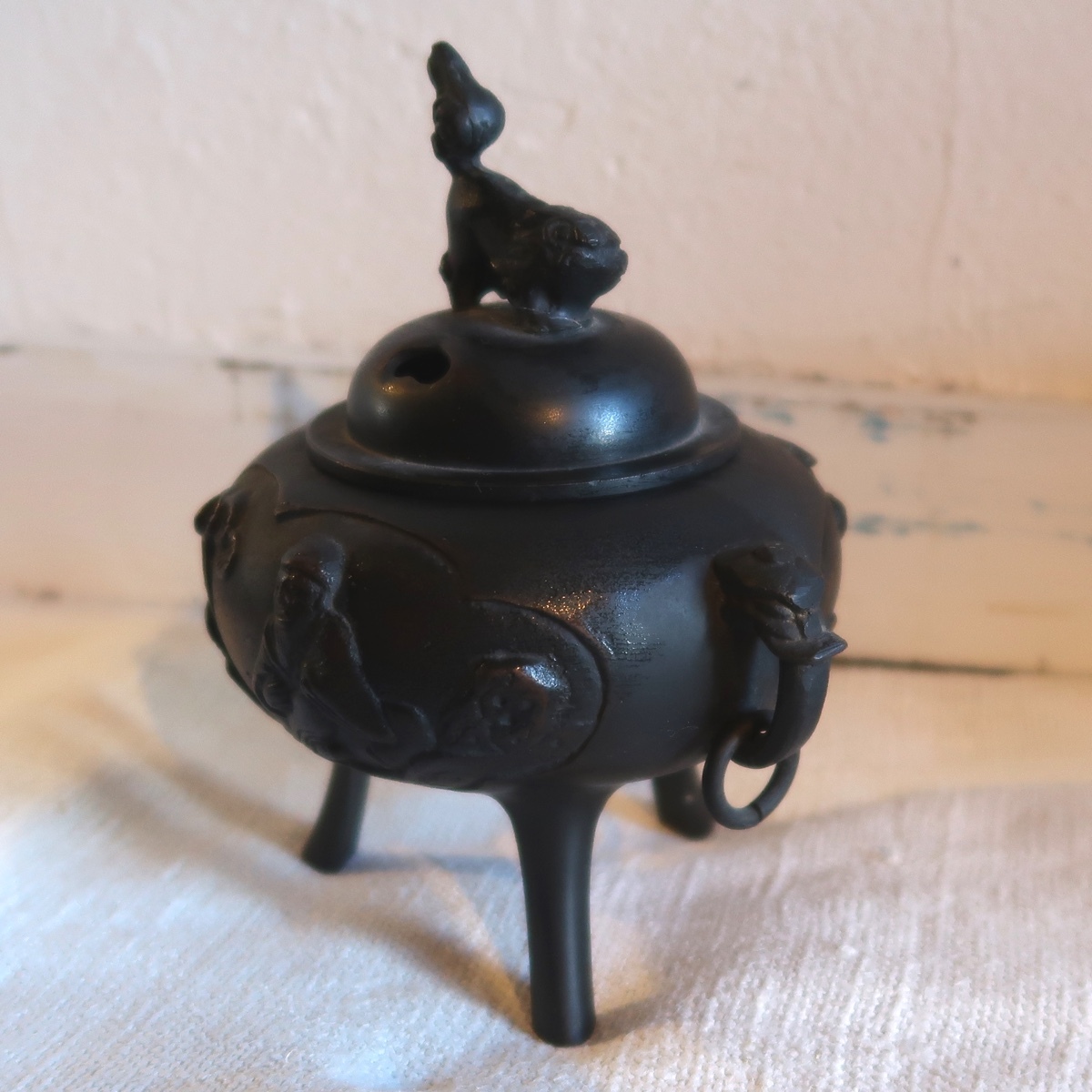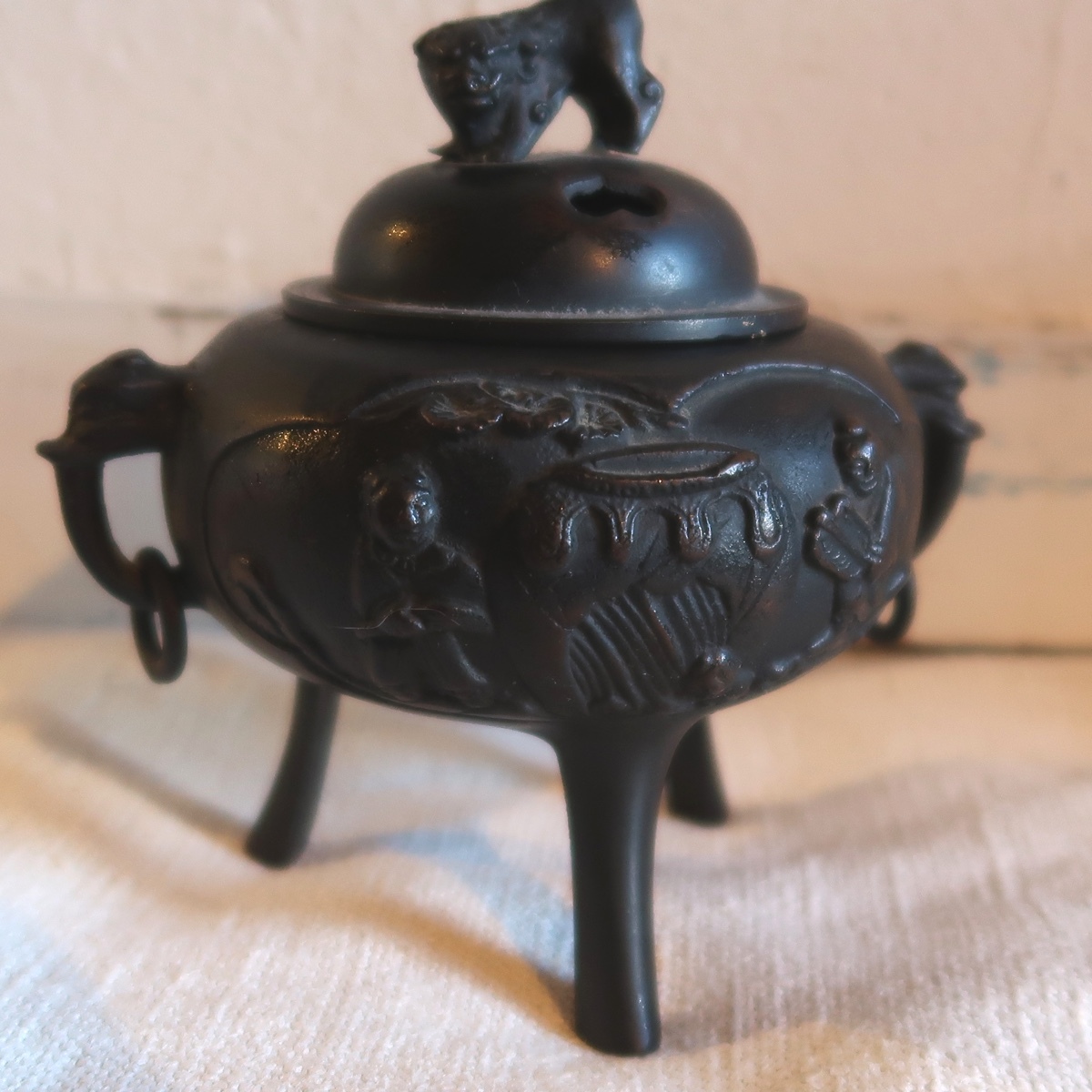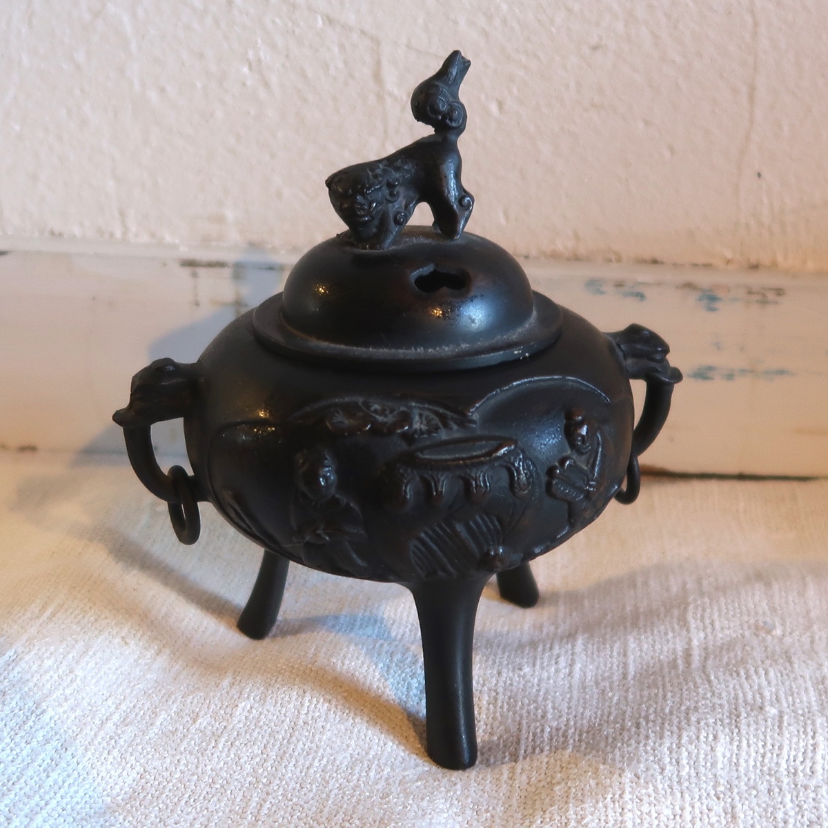 古い 三足 香炉 獅子蓋 鋳銅 香道具 古美術 骨董 時代もの 中古です。