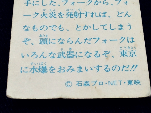 秘密戦隊ゴレンジャー ミニカード 70年代 バラ売り ・メーカー:山勝 ・1975年頃、当時の放送時に販売 ・6.6 cm x 5.0 cm ・同梱発送可能(複数落札の場合:定形、定形外郵便は、送料が変わる場合があります。) ・1-288番シリーズ ・1弾80種 001-080(タイトル違い.55.57.59.61.71.76.77,表修正.73) ・2弾32種 081-112 ・3弾64種 113-176 ・4弾48種 177-224 ・5弾32種 225-256 ・6弾32種 257-288 〓参考項目〓 ・原作:石森章太郎 ・脚本:上原正三 他 ・監督:竹本弘一 他 ・制作:テレビ朝日 ・放送期間:1975年4月- 1977年3月 ・全84話 〓出演〓 ・海城剛・アカレンジャー:誠直也 ・新命明・アオレンジャー:宮内洋 ・大岩大太・キレンジャー:畠山麦 ・熊野大五郎・2代目キレンジャー:だるま二郎 ・ペギー松山・モモレンジャー:小牧りさ ・明日香健二・ミドレンジャー:伊藤幸雄 ・江戸川総司令:高原駿雄 ・陽子・007:鹿沼えり ・黒十字軍総統:安藤三男、八名信夫 ・ナレーション:田中信夫、大平透 | ||
