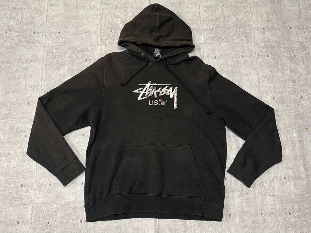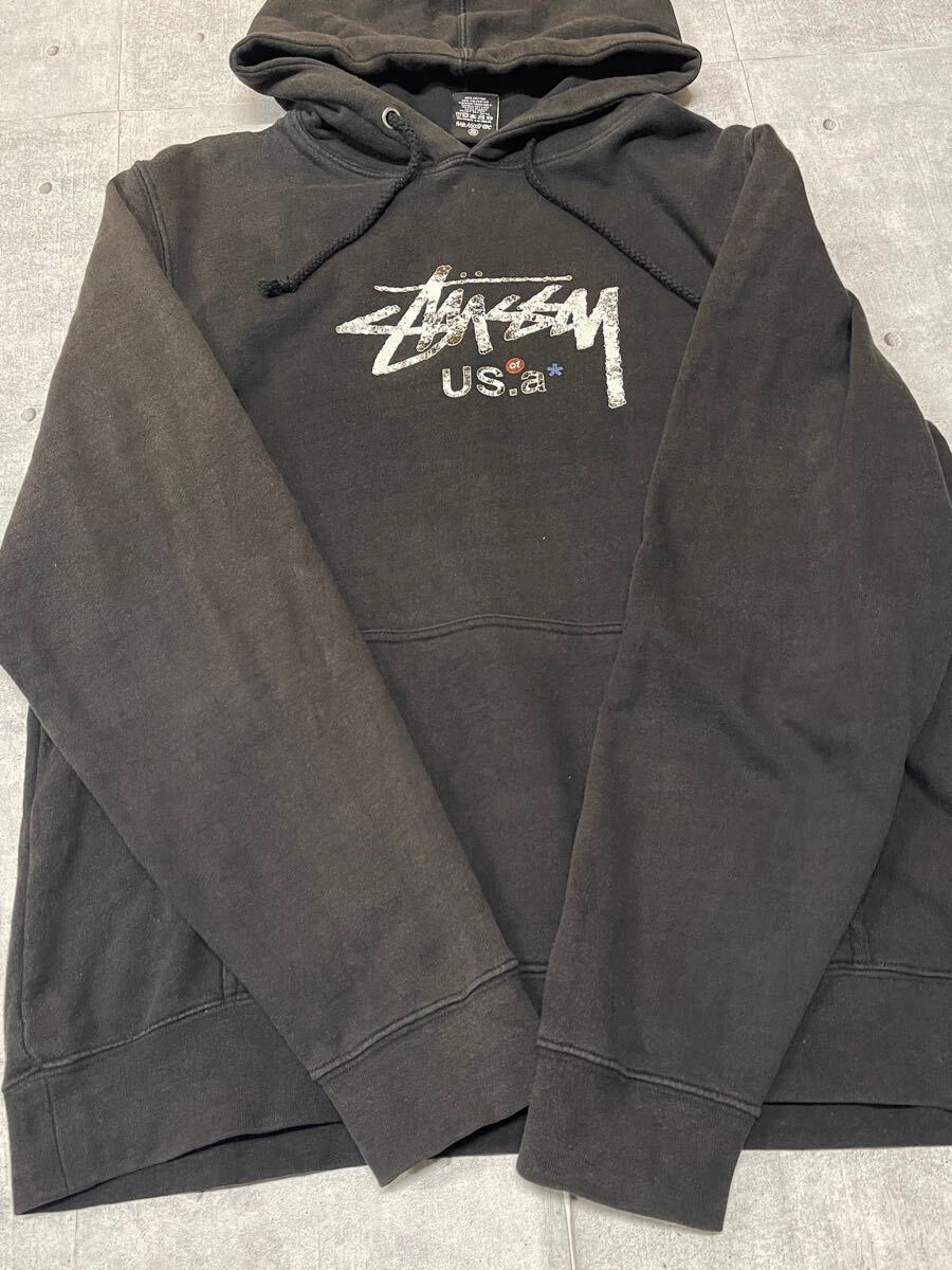 00s STUSSY USA ビッグロゴ フーディー オールドステューシー  00年代 スウェット トレーナー ブラック 黒 裏起毛 vintage加工ロゴ YL1176 ストリート サーフ スケート SOCAL スケボー サブカル