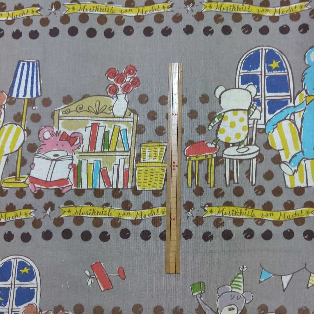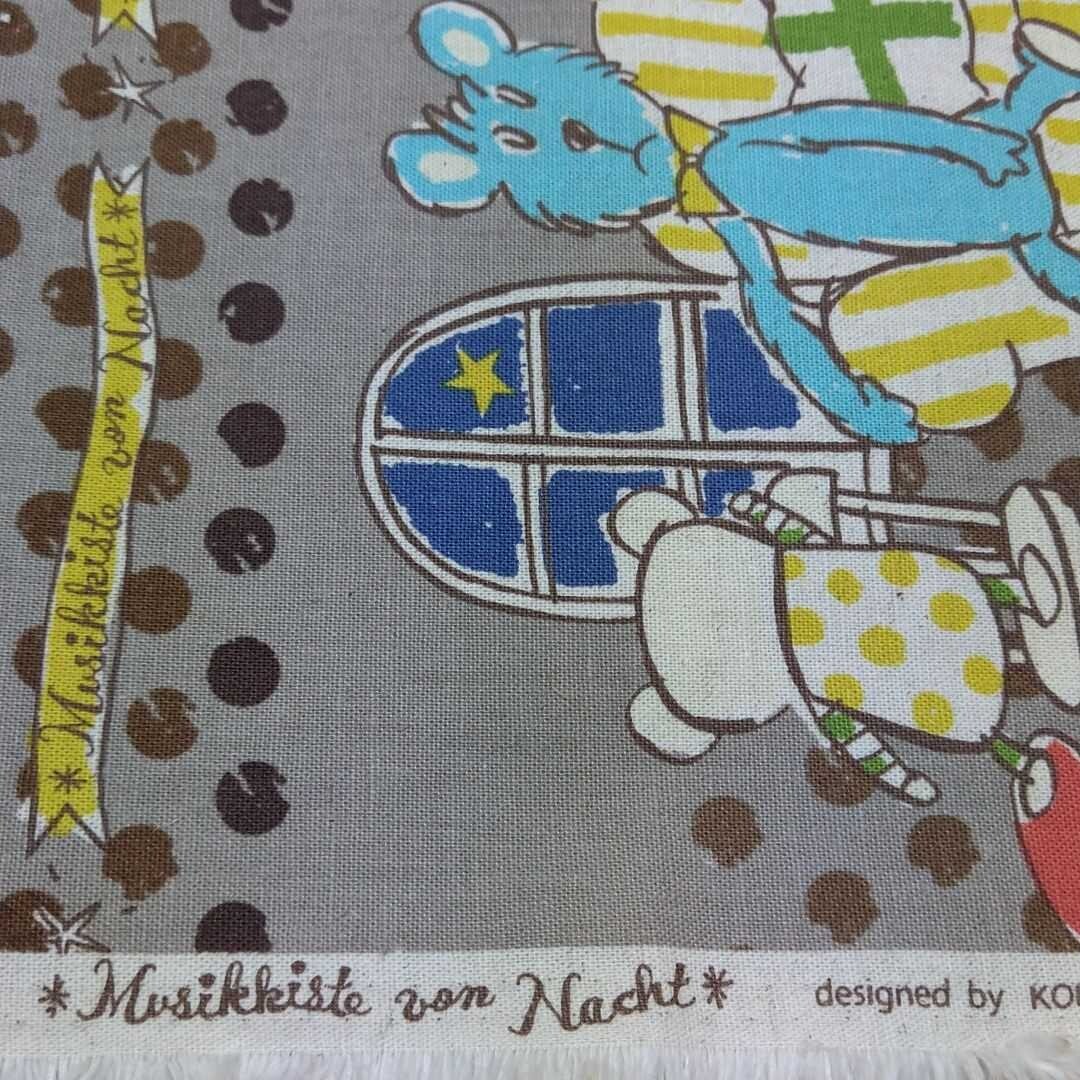 モカ茶色地にレトロなキャラクターが、とてもにぎやかでキュートな生地です(^^)
