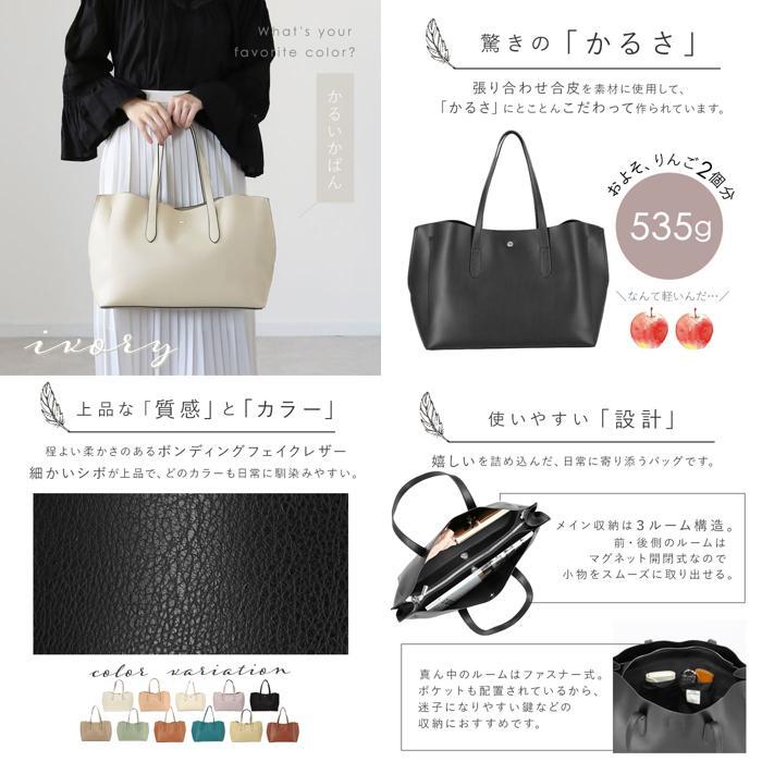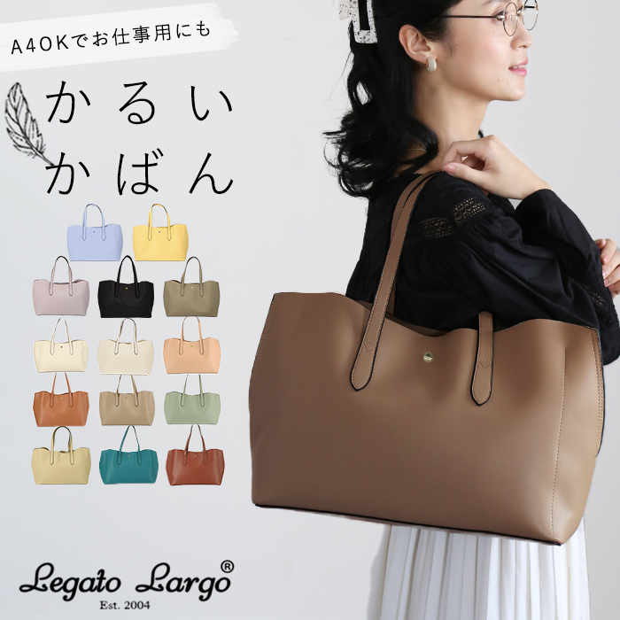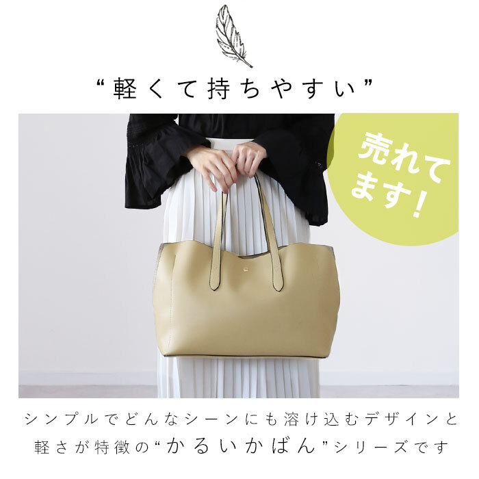 商品説明 | ・軽量の張り合わせ合皮を素材に使用した、軽くて持ちやすい、軽量化にこだわった「かるいかばん」。フォーマルな場所でもカジュアルでも、オンオフで使える!ちょっと大人めたっぷりサイズのトートバッグ。 ・ほどよいシボ感のある味わいのあるフェイクレザーと、単一カラーのシンプルなフォルム。メイン収納内側にも外側のカラーと同系色の裏生地を使用した落ち着いた色使いが魅力。 ・Legato Largoのロゴが入ったカシメが大人の女性の雰囲気にマッチするデザイン。 ・メイン収納は3ルーム仕様。中央の収納ルームはしっかりファスナー式!お財布など大切なアイテムはもちろん、マチがたっぷりあるのでランチボックスも平置きできちんと収納できる。 ・前側・後ろ側のルームはマグネットボタンでカンタン開閉。スマートフォンやパスケースなどサッと取り出したいものを入れておくのに便利な他、A4サイズのクリアホルダーも曲げずに入れておける! ・A4サイズのファイルがラクラク収納できて、床置きにする際にもしっかり自立。ビジネスに忙しい女性にも最適。小旅行程度の荷物のボリュームにも対応できるサイズ感も嬉しい。 ・細めのデザインで長さも十分の持ち手は、肩に通してお出掛けするのにちょうどいい♪ ・本体サイズは約535gと軽量。500mlのペットボトル飲料とほぼ同等の重さ! |
