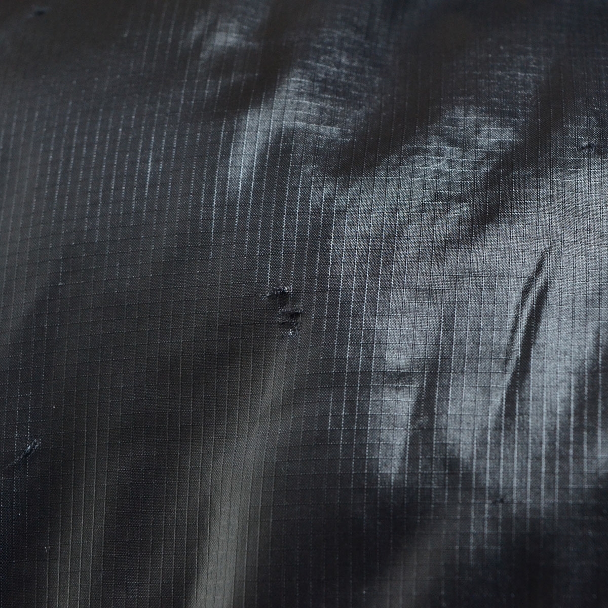 背面の左肩辺りに数mmほどの微細なヤブレが数点ございます。その他に目立ったヨゴレやダメージは見られません。
