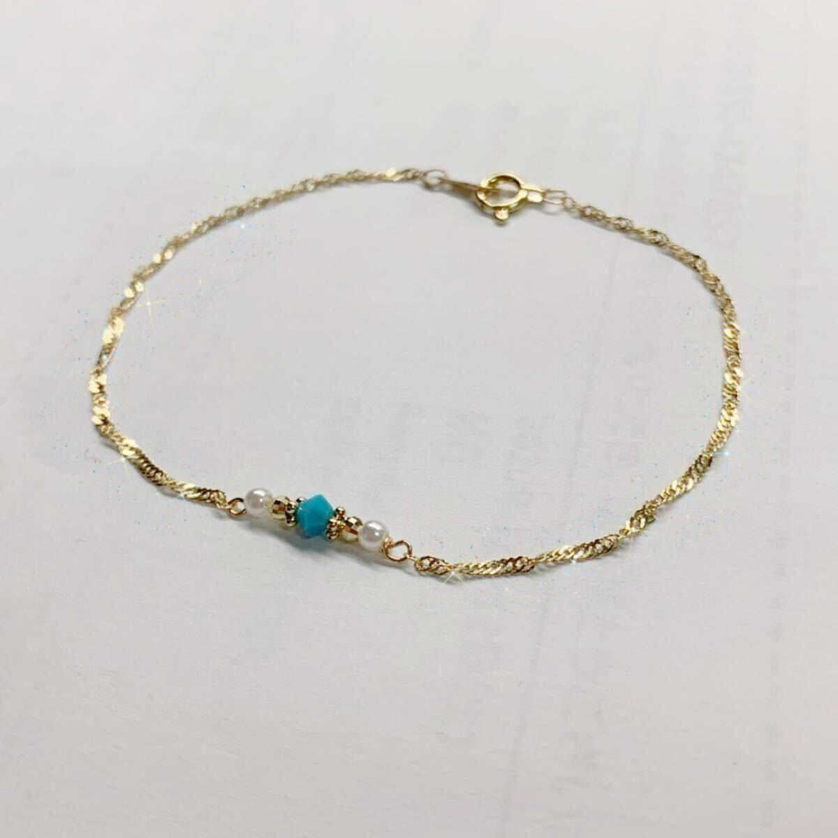 k18 18金 16cm ターコイズブレスレット アンクレット スクリューチェーン0.9mm 淡水パール2mm 3mm