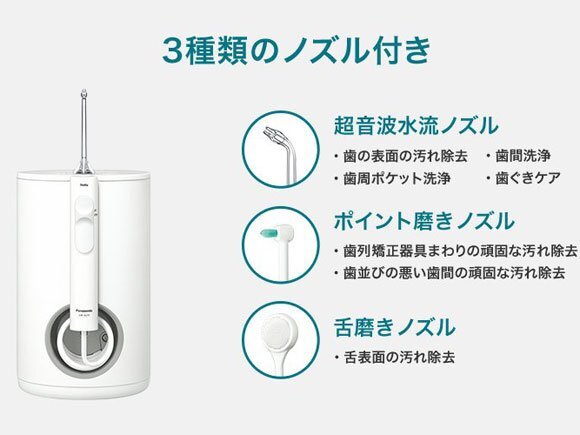 ●付属品:超音波水流ノズル×1本, ポイント磨きノズル×1本, 舌磨きノズル×1本, ノズルスタンド×1個