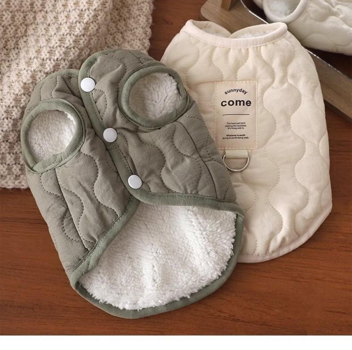 犬服 ドッグウェア コート ジャケット カーキ S ダウン ベスト 冬服 小さめ 防寒対策 寒さ対策 散歩 肌に優しい 綿生地 形崩れしにくい リード通し Dリング ハーネス ボタン 簡単 秋 冬 かっこいい 可愛い おしゃれ ファッション ノースリーブ