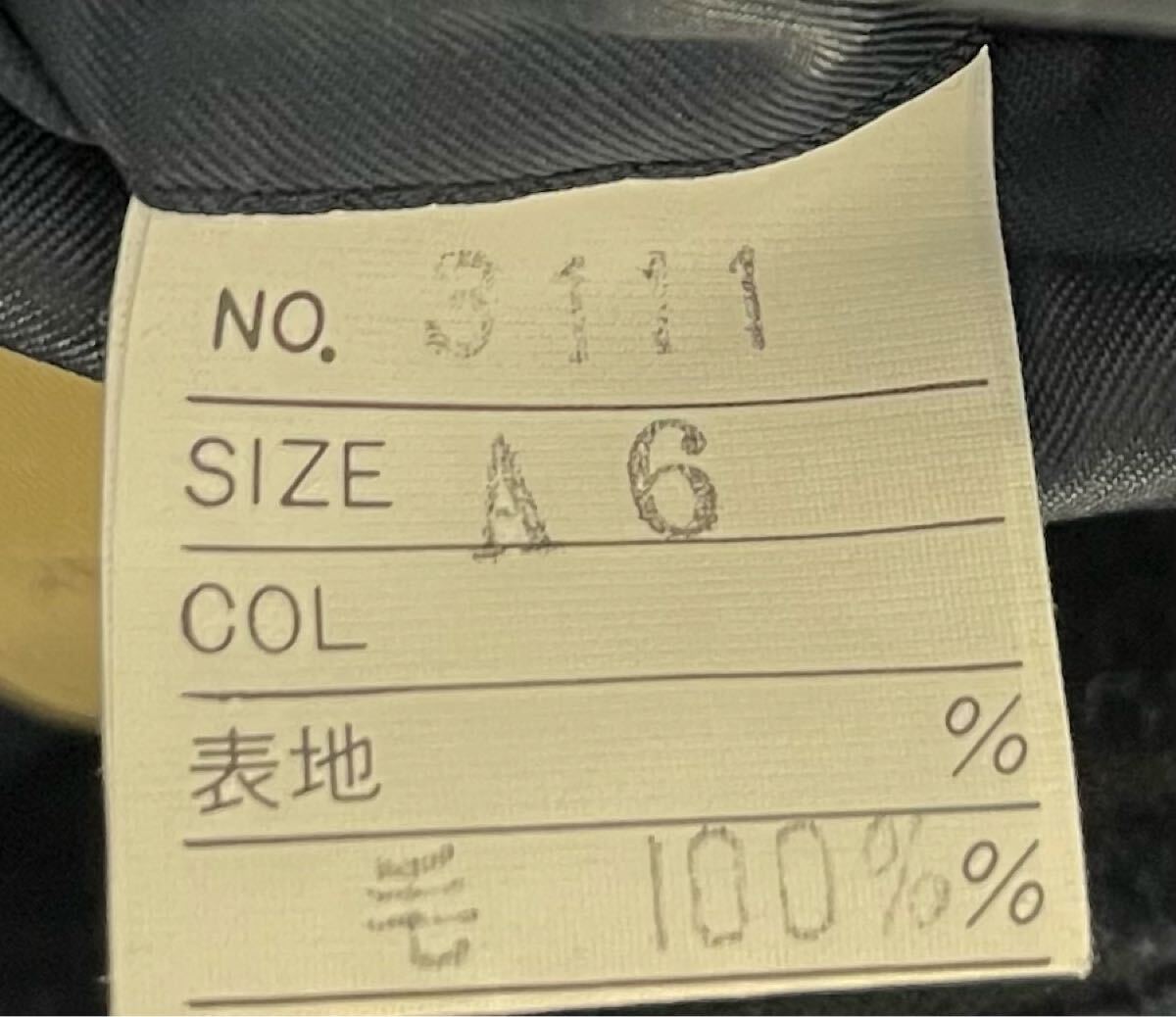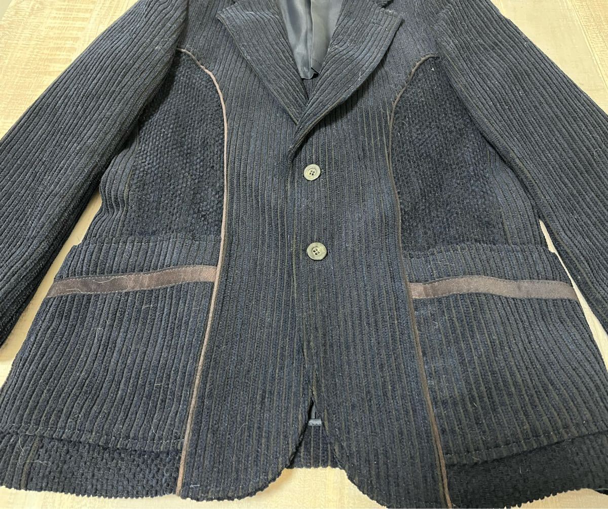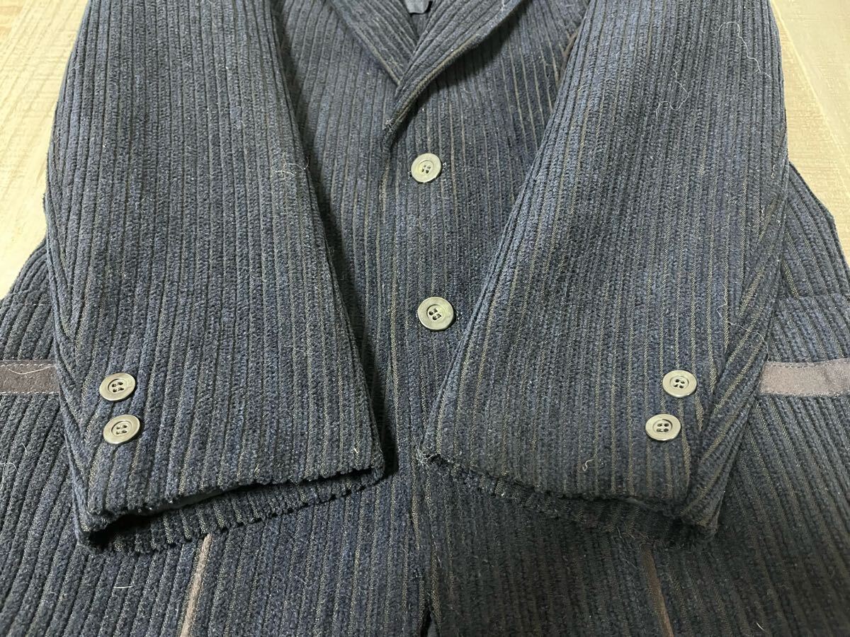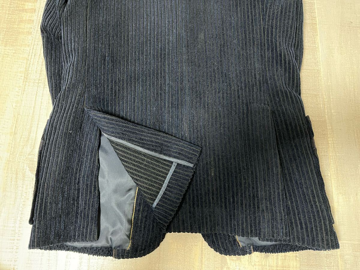 コーデュロイ素材のネイビーテーラードジャケット、二つボタン仕様。