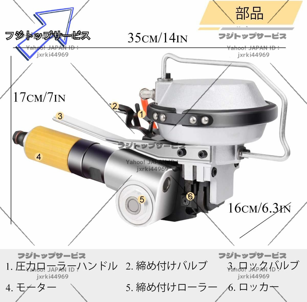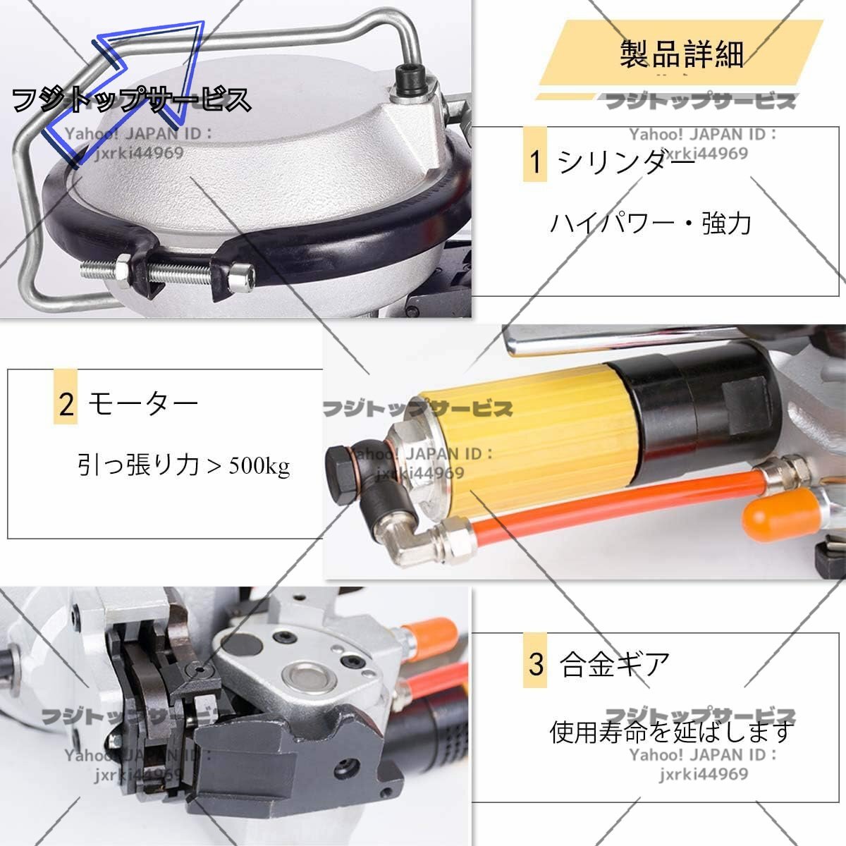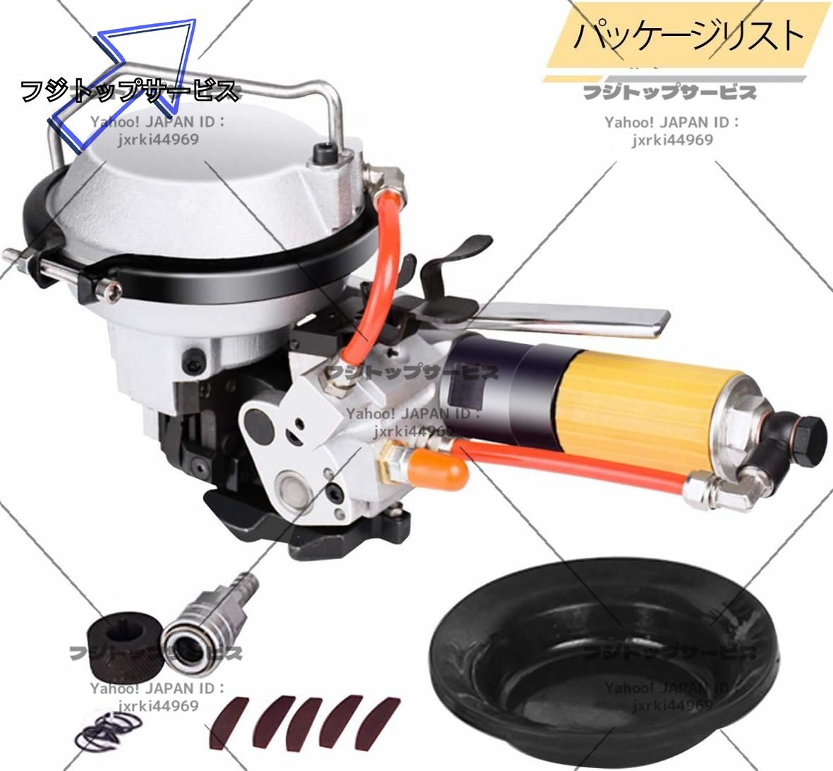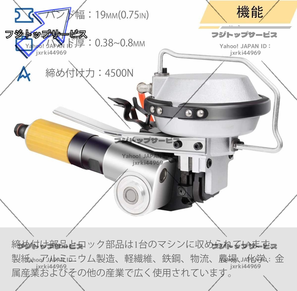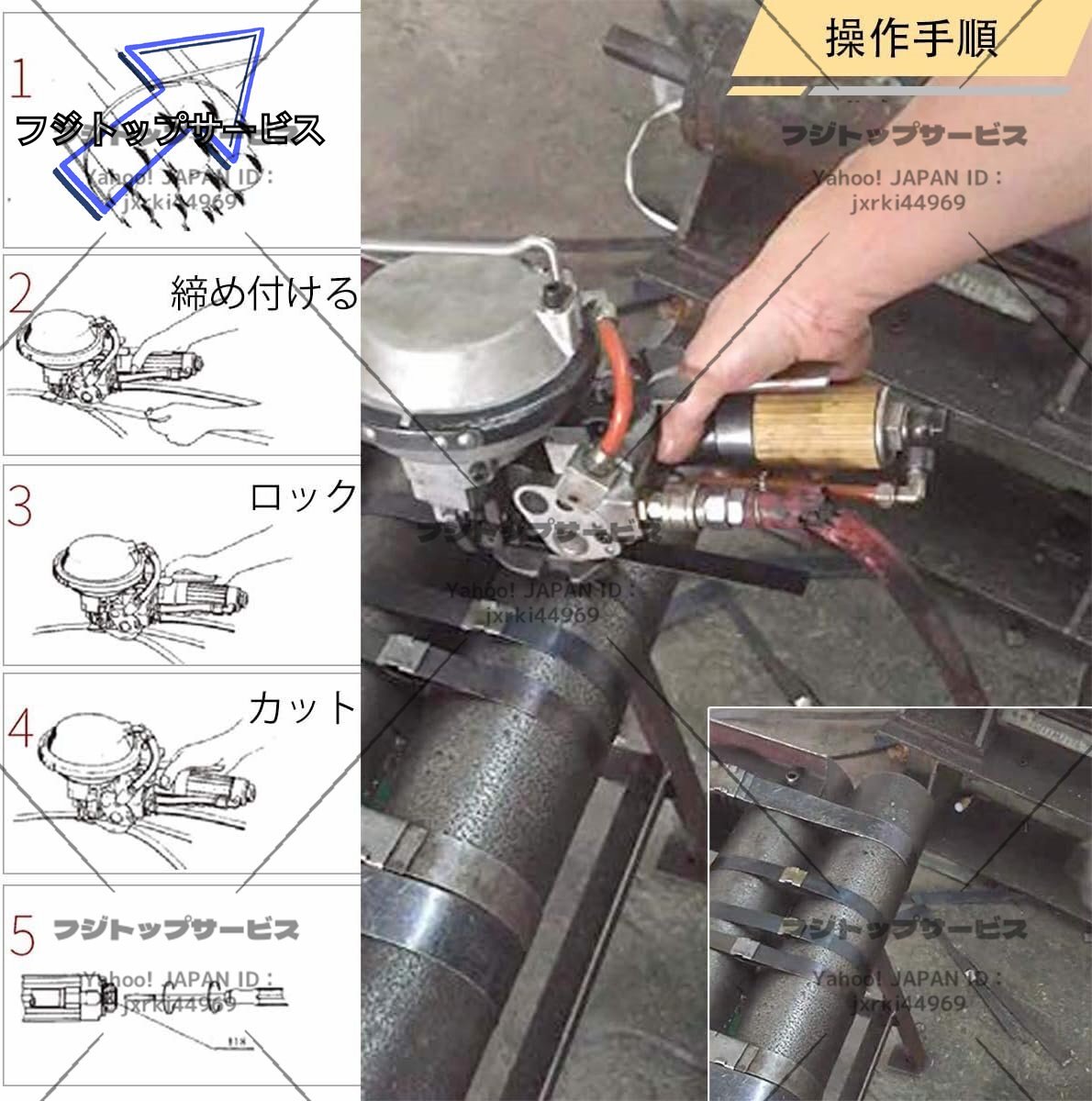 状態:新品未使用 状態:新品未使用 「ポータブル」軽量、取り扱いが容易でポータブル設計、低騒音かつ経済的なエアモータによって駆動された。 「エア駆動」エアコンプレッサーを装備する必要があります(付属しない)。要求気圧:0.42~0.63Mpa 「ハイパワーシリンダー」ハイパワーシリンダーはハイパワーシリンダーで設計されており、自動的に締め付け・ロック・切断され、より強力で引っ張り力が強くなります。 「4500N締め付け力」締め付け力は4500Nに達します。重いものも簡単に包装できます。 「適用範囲」バンド幅:19mm、バンド厚:0.38~0.8mm。アルミニウム、木材、木製の包装、化学繊維、綿、タバコ、薬品、食品、金属製品工業などに広く使われています。